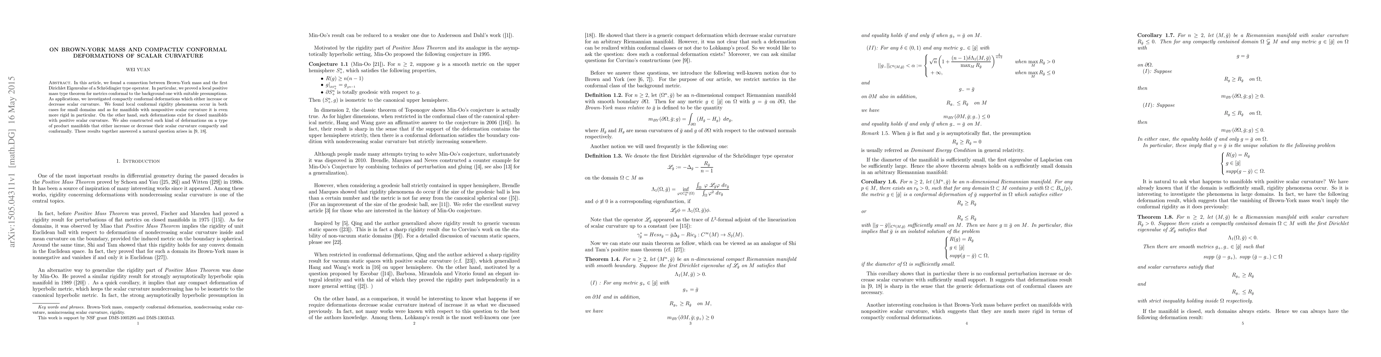 In this article, we found a connection between Brown-York mass and the first Dirichlet Eigenvalue of a Schr\"odingier type operator. In particular, we proved a local positive mass type theorem for metrics conformal to the background one with suitable presumptions. As applications, we investigated compactly conformal deformations which either increase or decrease scalar curvature. We found local conformal rigidity phenomena occur in both cases for small domains and as for manifolds with nonpositive scalar curvature it is even more rigid in particular. On the other hand, such deformations exist for closed manifolds with positive scalar curvature. We also constructed such kind of deformations on a type of product manifolds that either increase or decrease their scalar curvature compactly and conformally. These results together answered a natural question arises in \cite{Corvino, Lohkamp}.