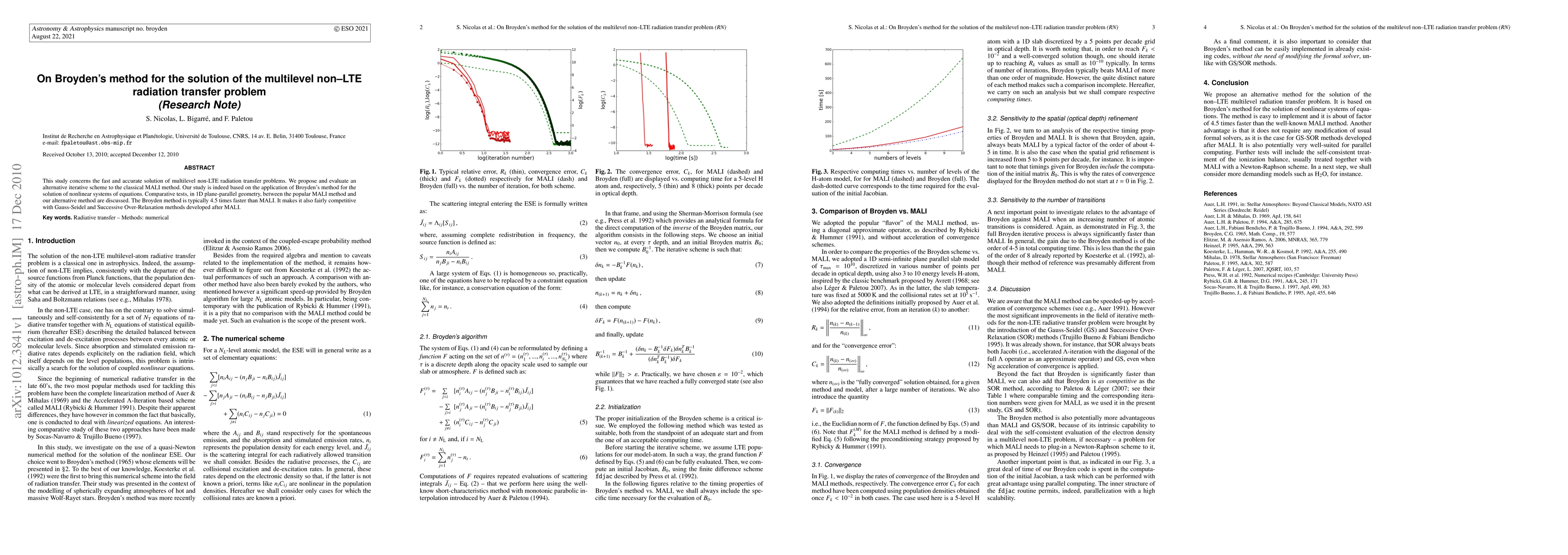 This paper proposes Broyden's method as an efficient alternative to the MALI method for solving multilevel non-LTE radiation transfer problems, demonstrating it to be 4.5 times faster and competitive with other iterative methods. Comparative tests in 1D plane-parallel geometry show significant improvements in speed.