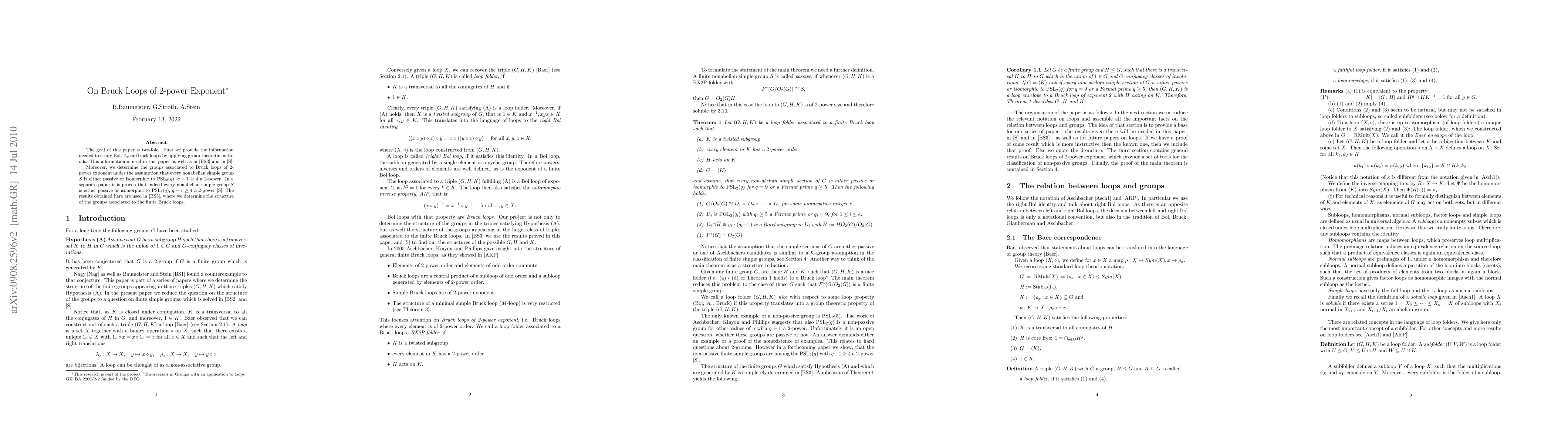 The goal of this paper is two-fold. First we provide the information needed to study Bol, $A_r$ or Bruck loops by applying group theoretic methods. This information is used in this paper as well as in [BS3] and in [S]. Moreover, we determine the groups associated to Bruck loops of 2-power exponent under the assumption that every nonabelian simple group $S$ is either passive or isomorphic to $\PSL_2(q)$, $q-1 \ge 4$ a $2$-power. In a separate paper it is proven that indeed every nonabelian simple group $S$ is either passive or isomorphic to $\PSL_2(q)$, $q-1 \ge 4$ a $2$-power [S]. The results obtained here are used in [BS3], where we determine the structure of the groups associated to the finite Bruck loops.