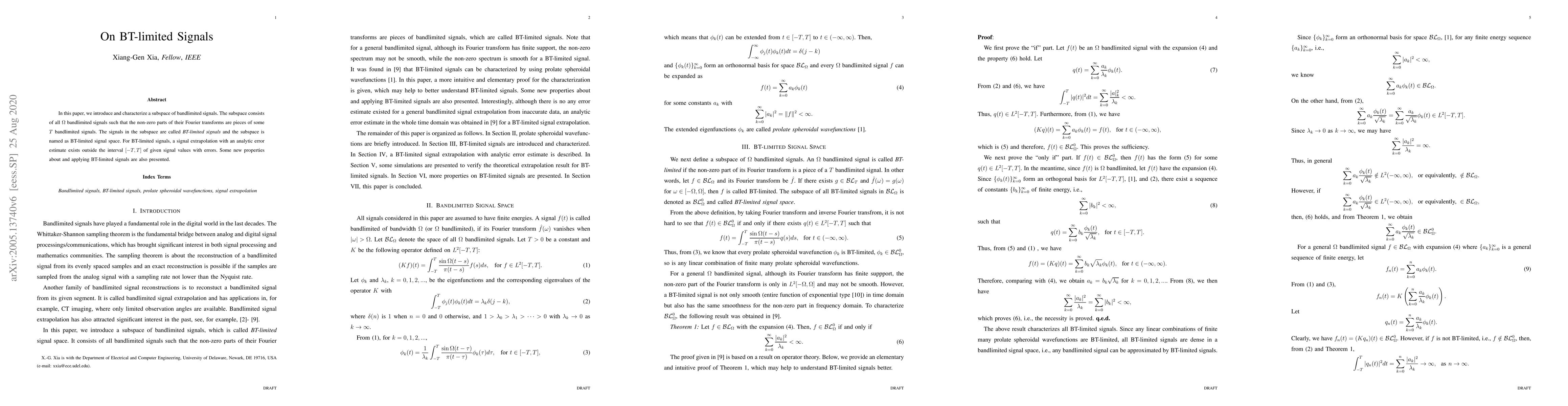 In this paper, we introduce and characterize a subspace of bandlimited signals. The subspace consists of all $\Omega$ bandlimited signals such that the non-zero parts of their Fourier transforms are pieces of some $T$ bandlimited signals. The signals in the subspace are called BT-limited signals and the subspace is named as BT-limited signal space. For BT-limited signals, a signal extrapolation with an analytic error estimate exists outside the interval [-T, T] of given signal values with errors. Some new properties about and applying BT-limited signals are also presented.