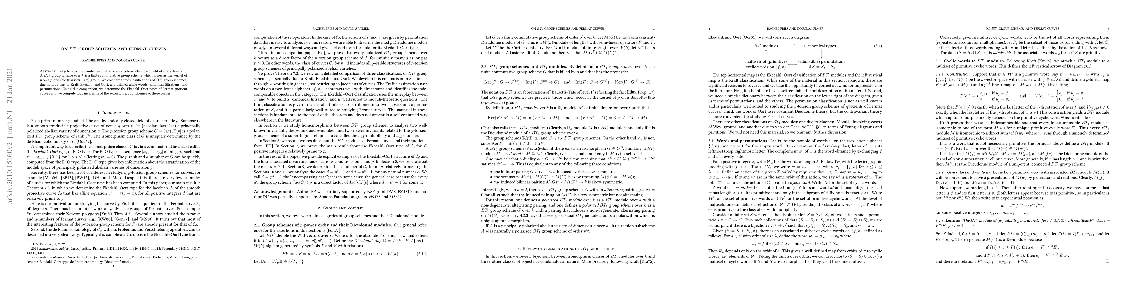 Let $p$ be a prime number and let $k$ be an algebraically closed field of characteristic $p$. A $BT_1$ group scheme over $k$ is a finite commutative group scheme which arises as the kernel of $p$ on a $p$-divisible (Barsotti--Tate) group. We compare three classifications of $BT_1$ group schemes, due in large part to Kraft, Ekedahl, and Oort, and defined using words, canonical filtrations, and permutations. Using this comparison, we determine the Ekedahl--Oort types of Fermat quotient curves and we compute four invariants of the $p$-torsion group schemes of these curves.