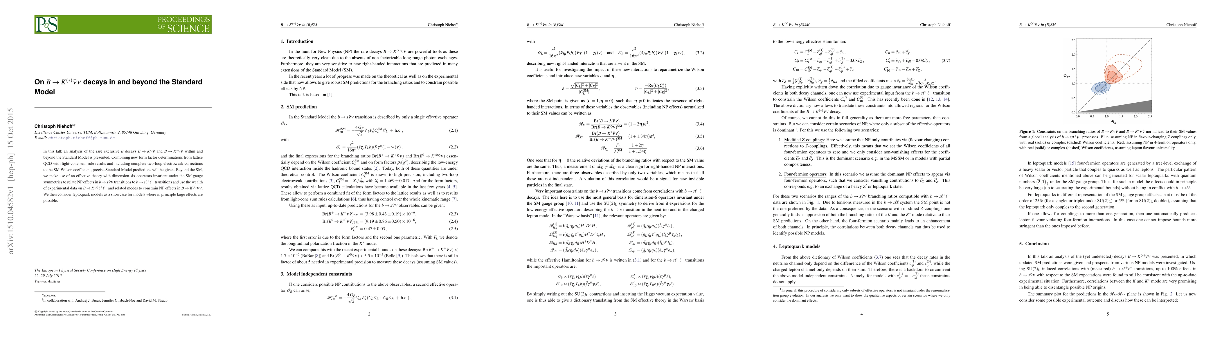 In this talk an analysis of the rare exclusive $B$ decays $B\to K\nu\bar\nu$ and $B\to K^{*}\nu\bar\nu$ within and beyond the Standard Model is presented. Combining new form factor determinations from lattice QCD with light-cone sum rule results and including complete two-loop electroweak corrections to the SM Wilson coefficient, precise Standard Model predictions will be given. Beyond the SM, we make use of an effective theory with dimension-six operators invariant under the SM gauge symmetries to relate NP effects in $b\to s\bar\nu\nu$ transitions to $b\to s\ell^+\ell^-$ transitions and use the wealth of experimental data on $B\to K^{(*)}\ell^+\ell^-$ and related modes to constrain NP effects in $B\to K^{(*)}\nu\bar\nu$. We then consider leptoquark models as a showcase for models where in principle large effects are possible.