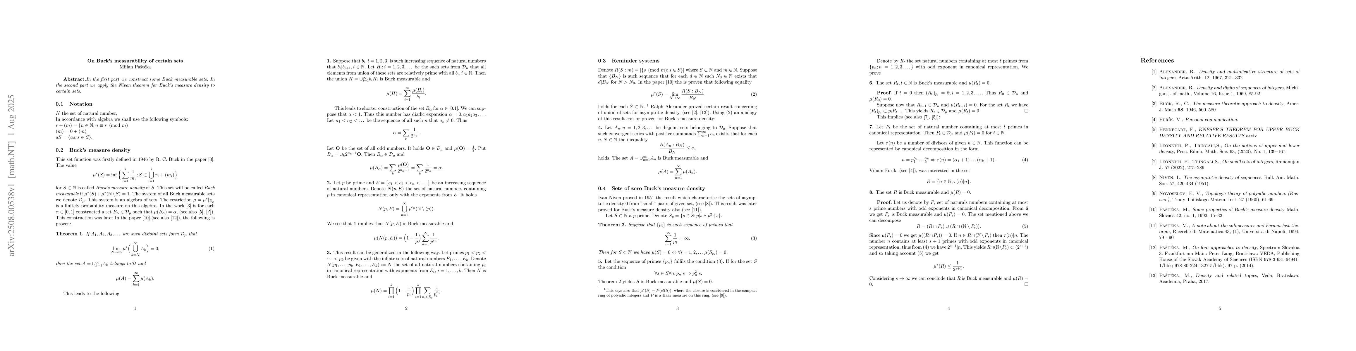 In the first part we construct some Buck measurable sets. In the second part we apply the Niven theorem for Buck's measure density to certain sets.