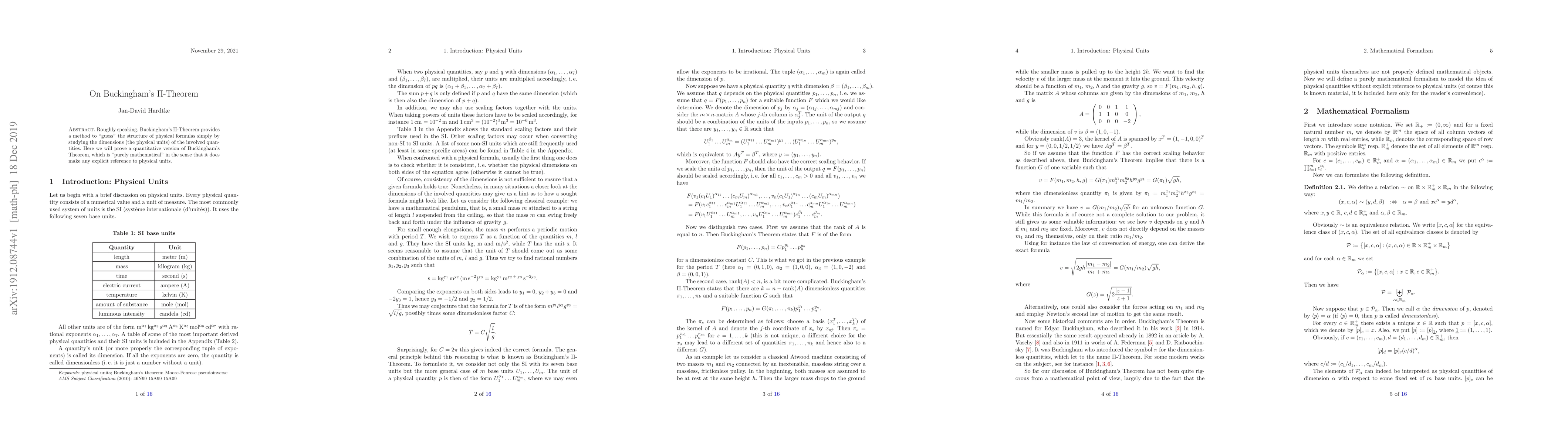 This paper proves a quantitative version of Buckingham's Pi-Theorem, providing a mathematical framework to predict physical formulas' structure solely based on the dimensions of involved quantities. The study offers a purely mathematical approach to solving dimensional analysis problems.