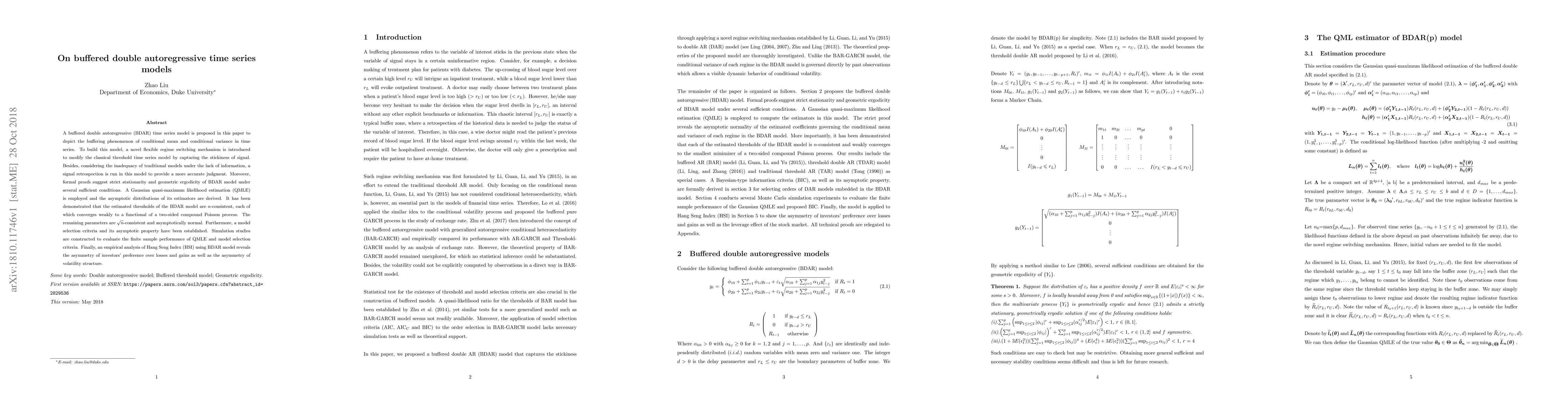 This paper proposes a buffered double autoregressive (BDAR) time series model to capture buffering phenomena in conditional mean and variance, employing a regime switching mechanism and signal retrospection. It demonstrates the model's strict stationarity and provides Gaussian quasi-maximum likelihood estimation, showing consistent and asymptotically normal parameter estimates.