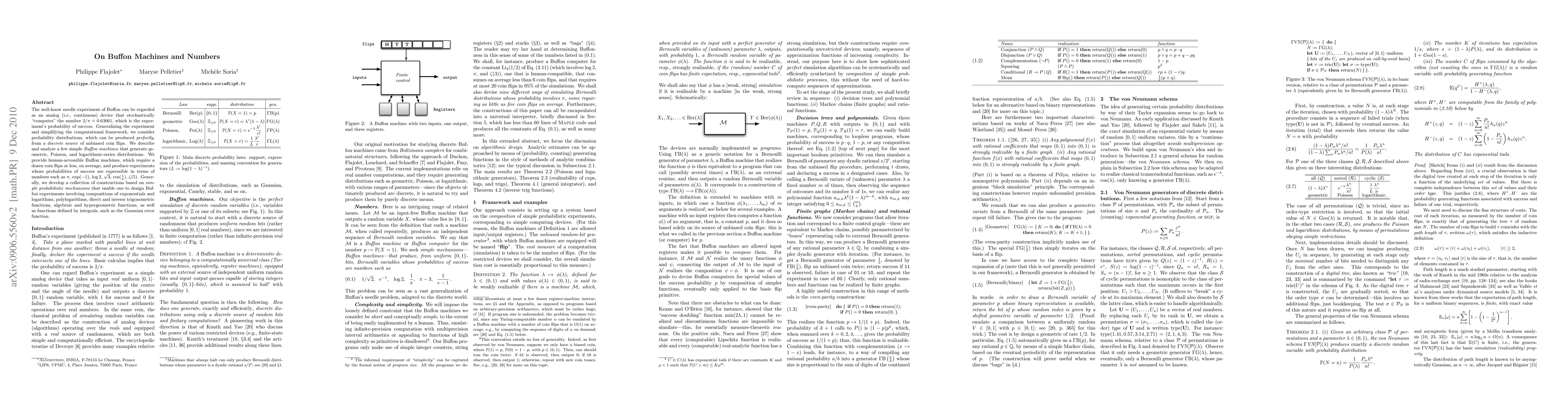The well-know needle experiment of Buffon can be regarded as an analog (i.e., continuous) device that stochastically "computes" the number 2/pi ~ 0.63661, which is the experiment's probability of success. Generalizing the experiment and simplifying the computational framework, we consider probability distributions, which can be produced perfectly, from a discrete source of unbiased coin flips. We describe and analyse a few simple Buffon machines that generate geometric, Poisson, and logarithmic-series distributions. We provide human-accessible Buffon machines, which require a dozen coin flips or less, on average, and produce experiments whose probabilities of success are expressible in terms of numbers such as, exp(-1), log 2, sqrt(3), cos(1/4), aeta(5). Generally, we develop a collection of constructions based on simple probabilistic mechanisms that enable one to design Buffon experiments involving compositions of exponentials and logarithms, polylogarithms, direct and inverse trigonometric functions, algebraic and hypergeometric functions, as well as functions defined by integrals, such as the Gaussian error function.