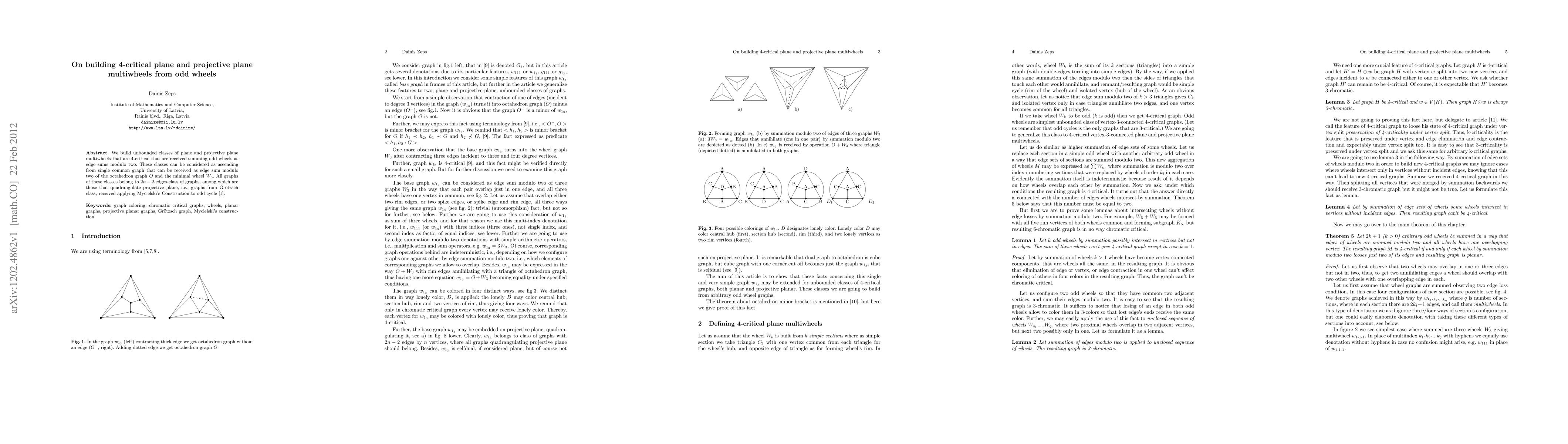 We build unbounded classes of plane and projective plane multiwheels that are 4-critical that are received summing odd wheels as edge sums modulo two. These classes can be considered as ascending from single common graph that can be received as edge sum modulo two of the octahedron graph O and the minimal wheel W3. All graphs of these classes belong to 2n-2-edges-class of graphs, among which are those that quadrangulate projective plane, i.e., graphs from Gr\"otzsch class, received applying Mycielski's Construction to odd cycle.