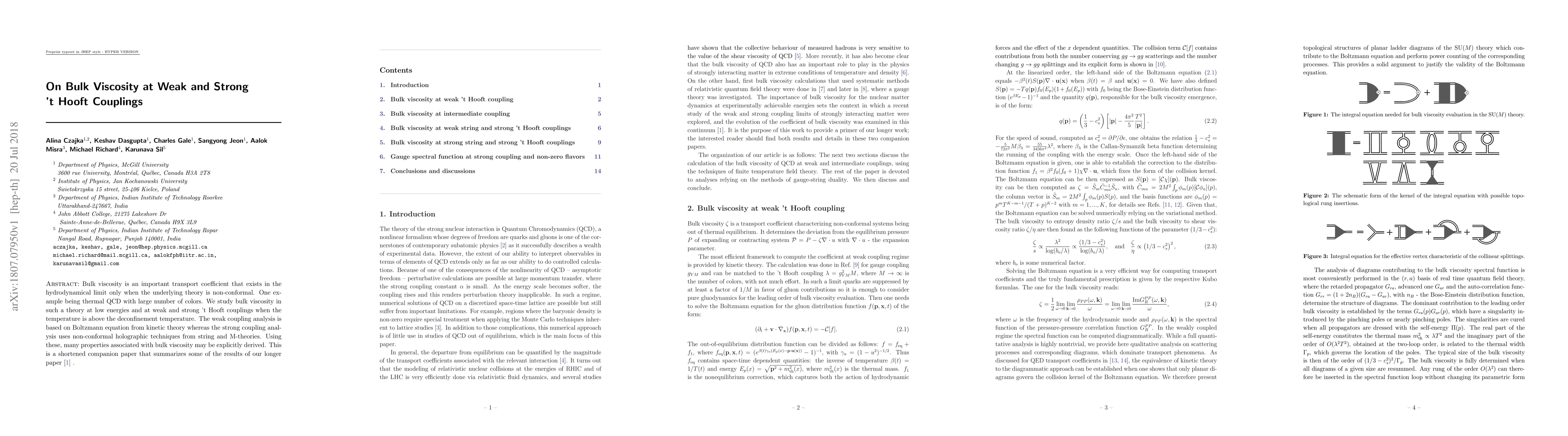 Bulk viscosity is an important transport coefficient that exists in the hydrodynamical limit only when the underlying theory is non-conformal. One example being thermal QCD with large number of colors. We study bulk viscosity in such a theory at low energies and at weak and strong 't Hooft couplings when the temperature is above the deconfinement temperature. The weak coupling analysis is based on Boltzmann equation from kinetic theory whereas the strong coupling analysis uses non-conformal holographic techniques from string and M-theories. Using these, many properties associated with bulk viscosity may be explicitly derived. This is a shortened companion paper that summarizes some of the results of our longer paper arXiv:1807.04713.