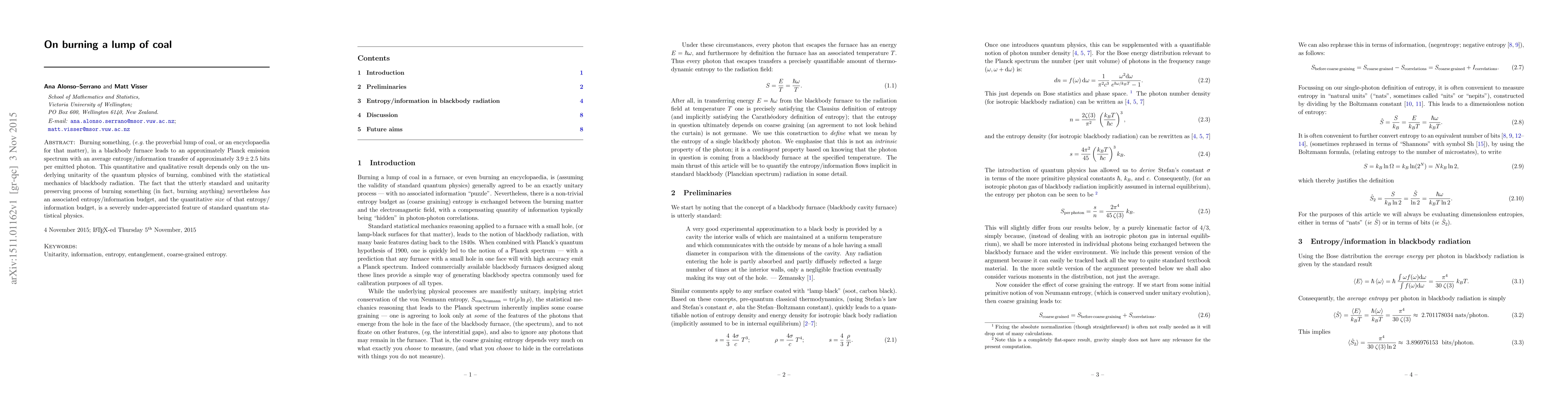 Burning something, (e.g. the proverbial lump of coal, or an encyclopaedia for that matter), in a blackbody furnace leads to an approximately Planck emission spectrum with an average entropy/information transfer of approximately $3.9 \pm 2.5$ bits per emitted photon. This quantitative and qualitative result depends only on the underlying unitarity of the quantum physics of burning, combined with the statistical mechanics of blackbody radiation. The fact that the utterly standard and unitarity preserving process of burning something (in fact, burning anything) nevertheless *has* an associated entropy/information budget, and the quantitative *size* of that entropy/information budget, is a severely under-appreciated feature of standard quantum statistical physics.