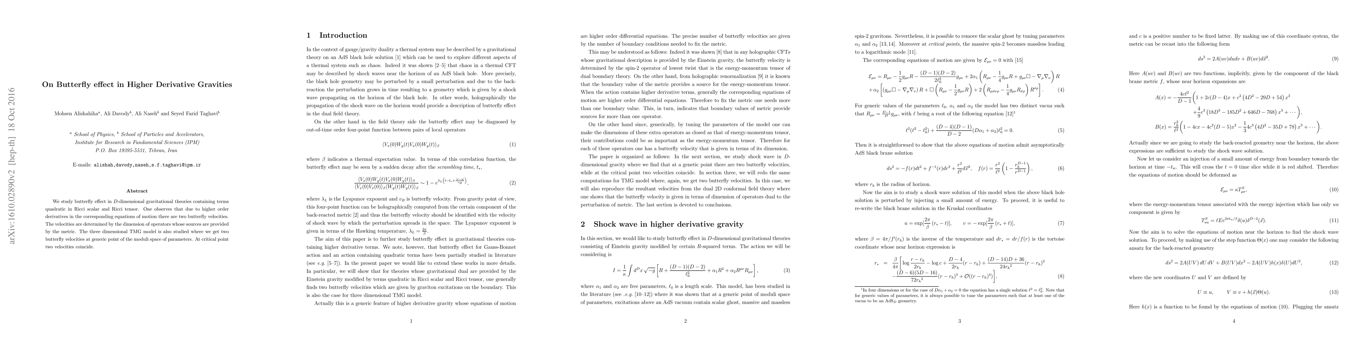 We study butterfly effect in $D$-dimensional gravitational theories containing terms quadratic in Ricci scalar and Ricci tensor. One observes that due to higher order derivatives in the corresponding equations of motion there are two butterfly velocities. The velocities are determined by the dimension of operators whose sources are provided by the metric. The three dimensional TMG model is also studied where we get two butterfly velocities at generic point of the moduli space of parameters. At critical point two velocities coincide.