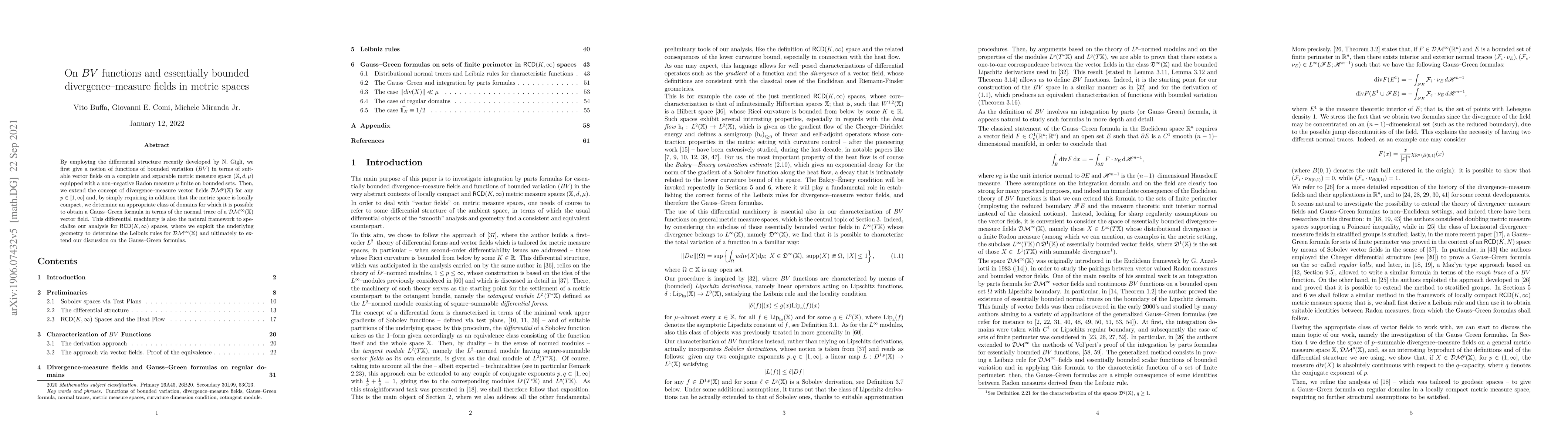 By employing the differential structure recently developed by N. Gigli, we first give a notion of functions of bounded variation ($BV$) in terms of suitable vector fields on a complete and separable metric measure space $(\mathbb{X},d,\mu)$ equipped with a non-negative Radon measure $\mu$ finite on bounded sets. Then, we extend the concept of divergence-measure vector fields $\mathcal{DM}^p(\mathbb{X})$ for any $p\in[1,\infty]$ and, by simply requiring in addition that the metric space is locally compact, we determine an appropriate class of domains for which it is possible to obtain a Gauss-Green formula in terms of the normal trace of a $\mathcal{DM}^\infty(\mathbb{X})$ vector field. This differential machinery is also the natural framework to specialize our analysis for ${\mathsf{RCD}(K,\infty)}$ spaces, where we exploit the underlying geometry to determine the Leibniz rules for $\mathcal{DM}^\infty(\mathbb{X})$ and ultimately to extend our discussion on the Gauss-Green formulas.
