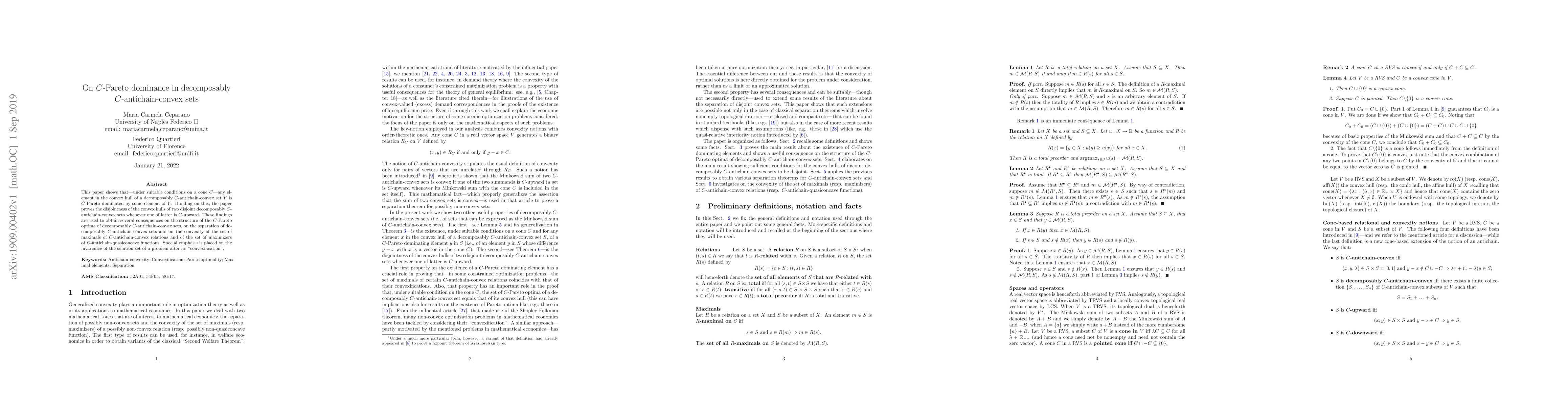 This paper shows that---under suitable conditions on a cone $C$---any element in the convex hull of a decomposably $C$-antichain-convex set $Y$ is $C$-Pareto dominated by some element of $Y$. Building on this, the paper proves the disjointness of the convex hulls of two disjoint decomposably $C$-antichain-convex sets whenever one of latter is $C$-upward. These findings are used to obtain several consequences on the structure of the $C$-Pareto optima of decomposably $C$-antichain-convex sets, on the separation of decomposably $C$-antichain-convex sets and on the convexity of the set of maximals of $C$-antichain-convex relations and of the set of maximizers of $C$-antichain-quasiconcave functions. Special emphasis is placed on the invariance of the solution set of a problem after its "convexification".