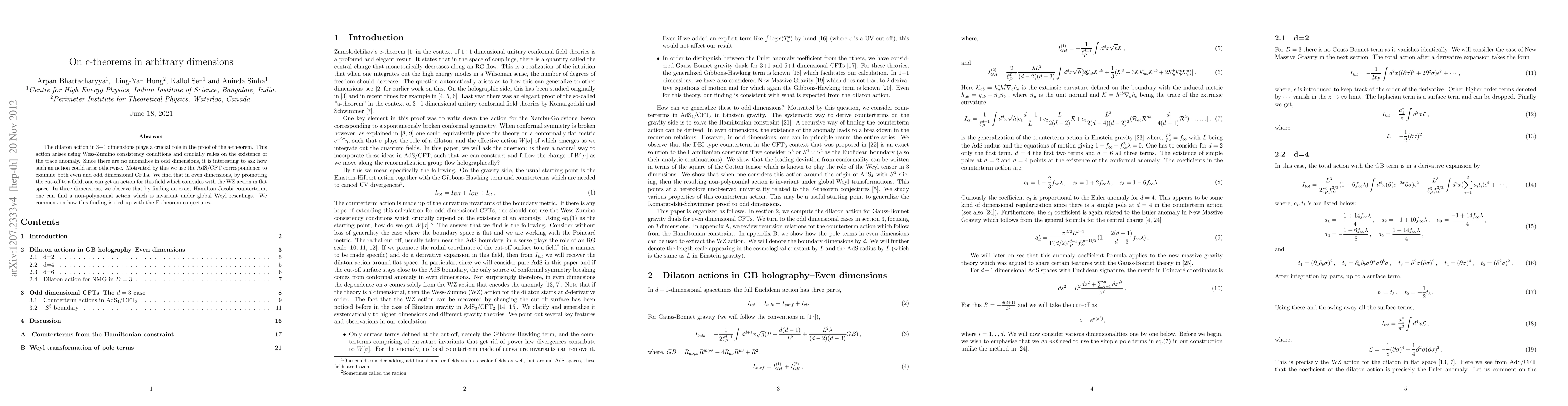 The dilaton action in 3+1 dimensions plays a crucial role in the proof of the a-theorem. This action arises using Wess-Zumino consistency conditions and crucially relies on the existence of the trace anomaly. Since there are no anomalies in odd dimensions, it is interesting to ask how such an action could arise otherwise. Motivated by this we use the AdS/CFT correspondence to examine both even and odd dimensional CFTs. We find that in even dimensions, by promoting the cut-off to a field, one can get an action for this field which coincides with the WZ action in flat space. In three dimensions, we observe that by finding an exact Hamilton-Jacobi counterterm, one can find a non-polynomial action which is invariant under global Weyl rescalings. We comment on how this finding is tied up with the F-theorem conjectures.