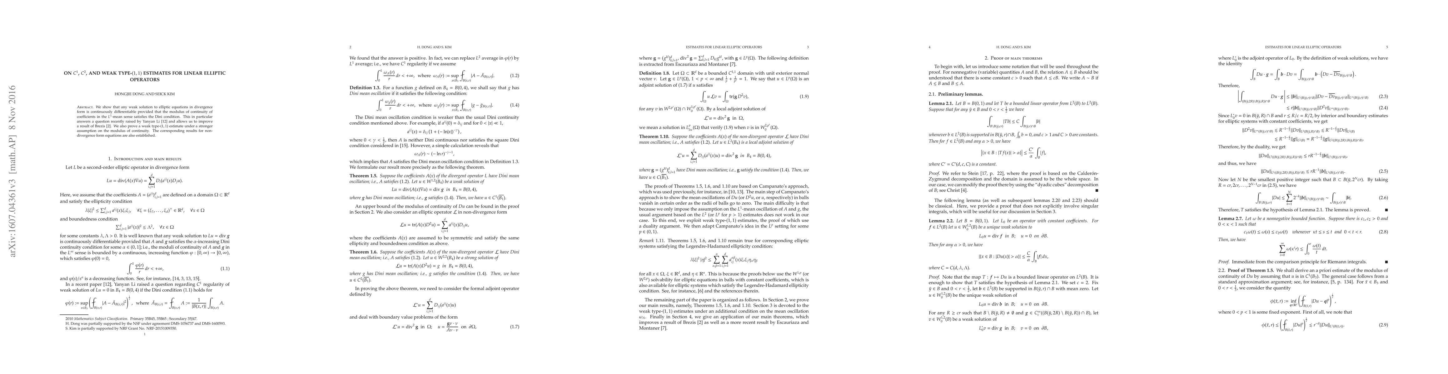 We show that any weak solution to elliptic equations in divergence form is continuously differentiable provided that the modulus of continuity of coefficients in the $L^1$-mean sense satisfies the Dini condition. This in particular answers a question recently raised by Yanyan Li and allows us to improve a result of Brezis. We also prove a weak type-$(1,1)$ estimate under a stronger assumption on the modulus of continuity. The corresponding results for non-divergence form equations are also established.