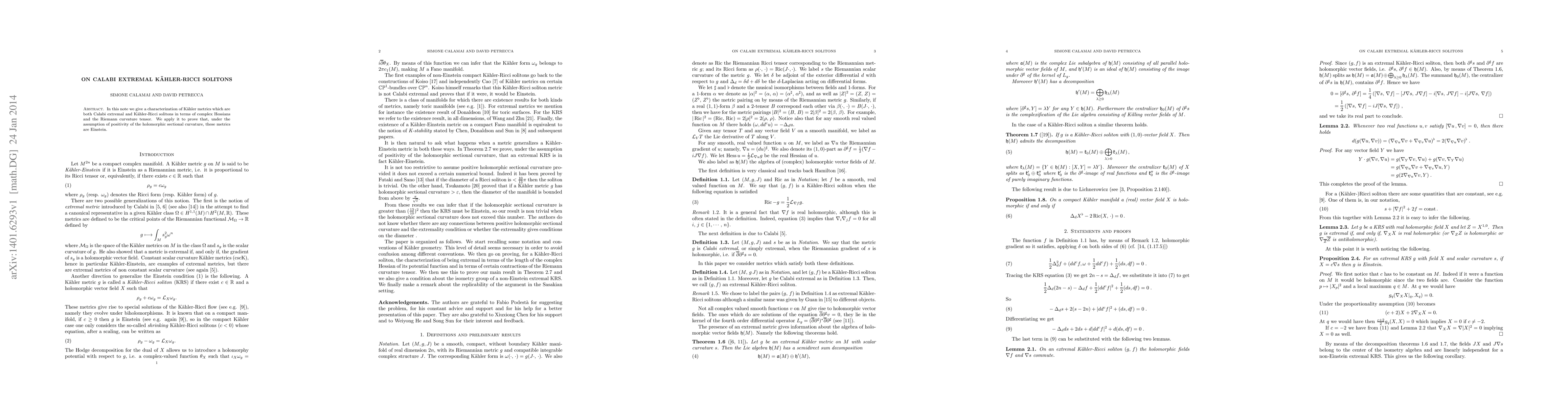 This paper characterizes Kaehler metrics that are both Calabi extremal and Kaehler-Ricci solitons using complex Hessians and Riemann curvature tensors. It concludes that, with positive holomorphic sectional curvature, such metrics are Einstein.