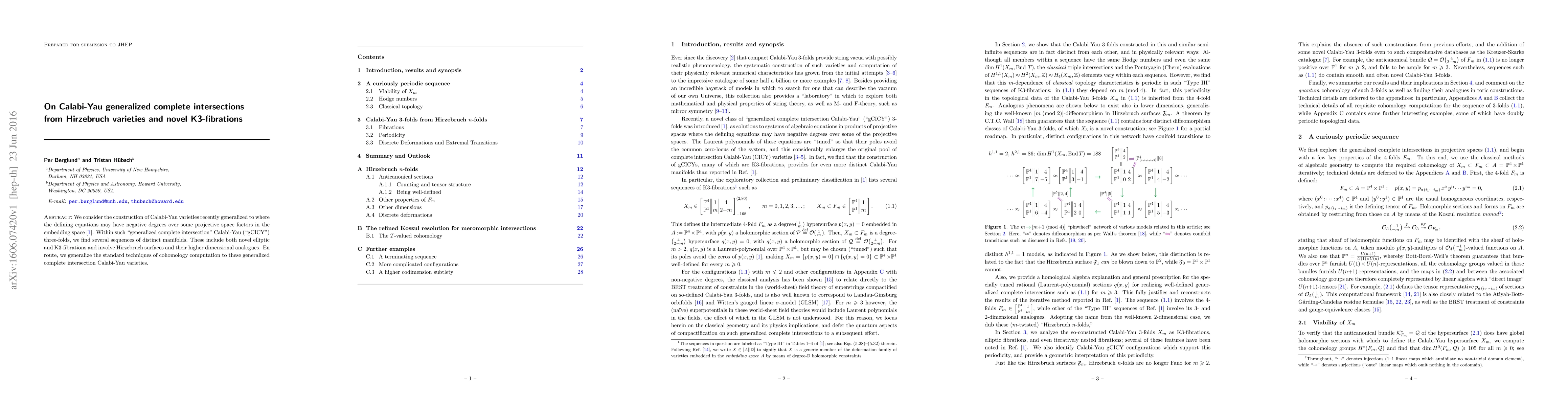 Summary: The paper constructs Calabi-Yau three-folds as generalized complete intersections with negative degree equations and discovers new elliptic and K3-fibrations using Hirzebruch surfaces, alongside a generalization of cohomology computation techniques.