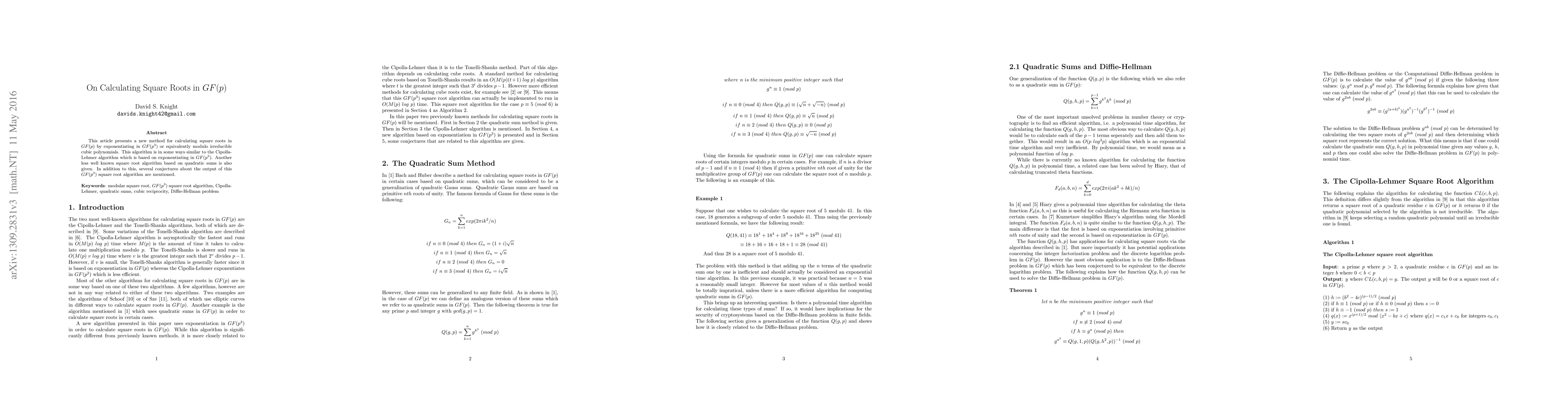 This paper introduces a novel method for calculating square roots in GF(p) using exponentiation in GF(p^3) and explores a less known quadratic sums algorithm, comparing it to the Cipolla-Lehmer algorithm, and presents conjectures regarding the outcomes of the new method.