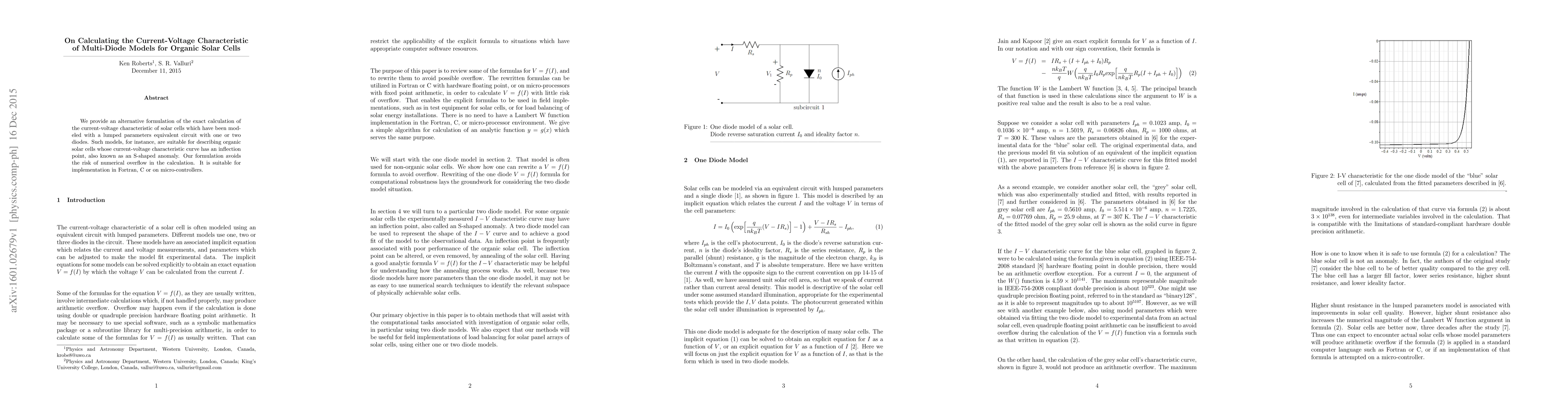 This paper presents a new method for calculating the current-voltage characteristics of organic solar cells modeled with one or two diodes, avoiding numerical overflow and enabling implementation in various programming languages and hardware. The method is particularly useful for cells exhibiting an S-shaped current-voltage curve.