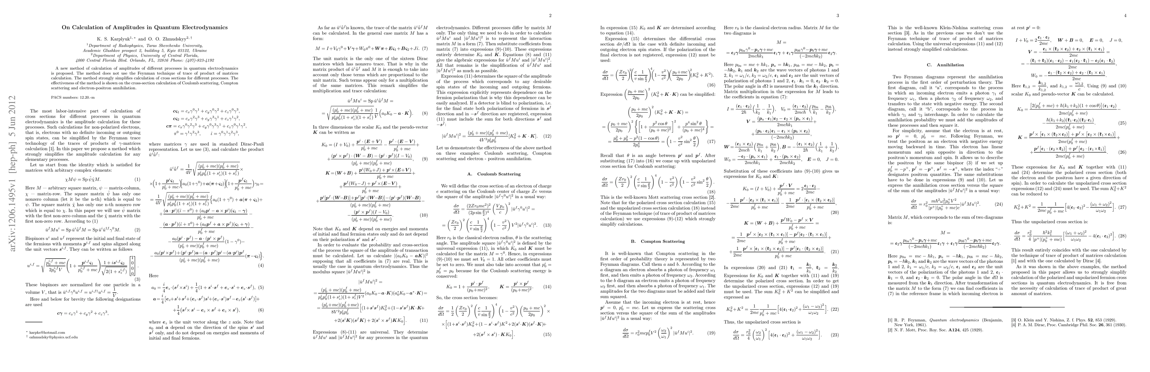 This paper introduces a novel method for calculating amplitudes in quantum electrodynamics that simplifies cross-section calculations, avoiding the traditional Feynman matrix trace technique. The method's effectiveness is demonstrated through applications to Coulomb, Compton scattering, and electron-positron annihilation.