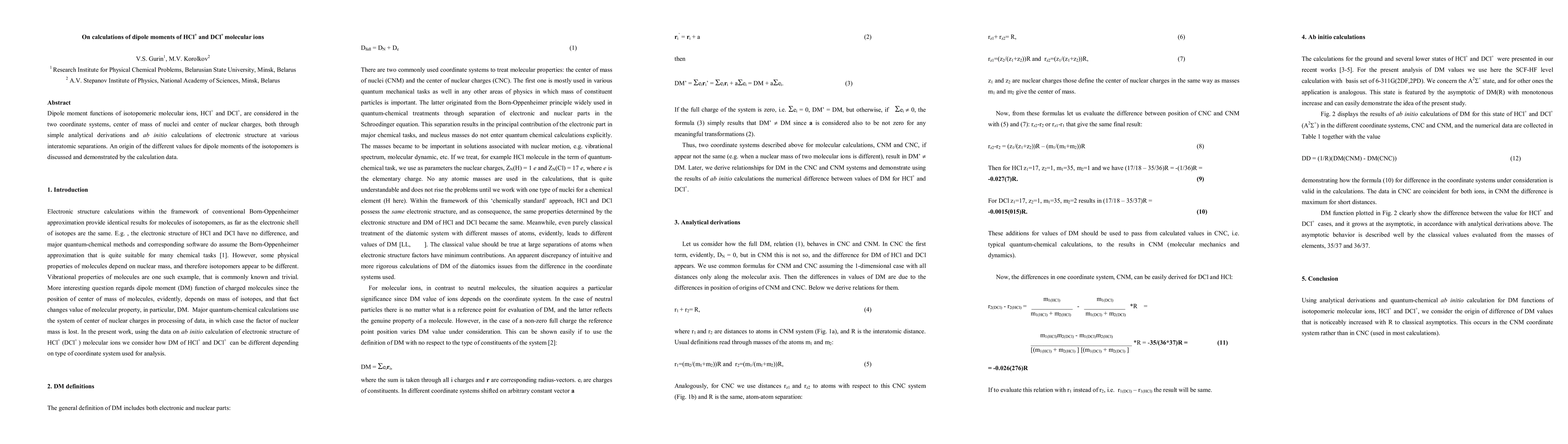 This paper investigates the dipole moment functions of HCl+ and DCl+ ions using both analytical derivations and ab initio calculations, comparing results from two coordinate systems: the center of mass and the center of nuclear charges. It highlights the origin of differing dipole moment values for the isotopomers.