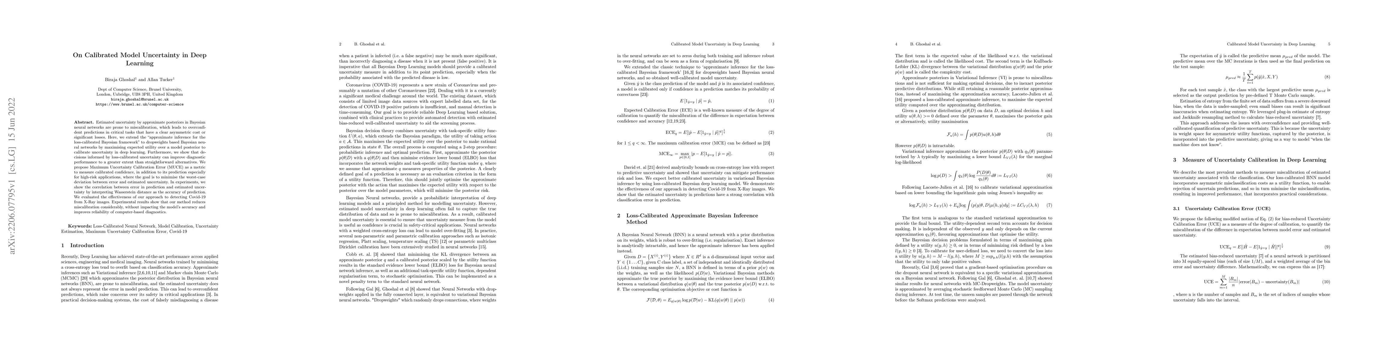 Estimated uncertainty by approximate posteriors in Bayesian neural networks are prone to miscalibration, which leads to overconfident predictions in critical tasks that have a clear asymmetric cost or significant losses. Here, we extend the approximate inference for the loss-calibrated Bayesian framework to dropweights based Bayesian neural networks by maximising expected utility over a model posterior to calibrate uncertainty in deep learning. Furthermore, we show that decisions informed by loss-calibrated uncertainty can improve diagnostic performance to a greater extent than straightforward alternatives. We propose Maximum Uncertainty Calibration Error (MUCE) as a metric to measure calibrated confidence, in addition to its prediction especially for high-risk applications, where the goal is to minimise the worst-case deviation between error and estimated uncertainty. In experiments, we show the correlation between error in prediction and estimated uncertainty by interpreting Wasserstein distance as the accuracy of prediction. We evaluated the effectiveness of our approach to detecting Covid-19 from X-Ray images. Experimental results show that our method reduces miscalibration considerably, without impacting the models accuracy and improves reliability of computer-based diagnostics.