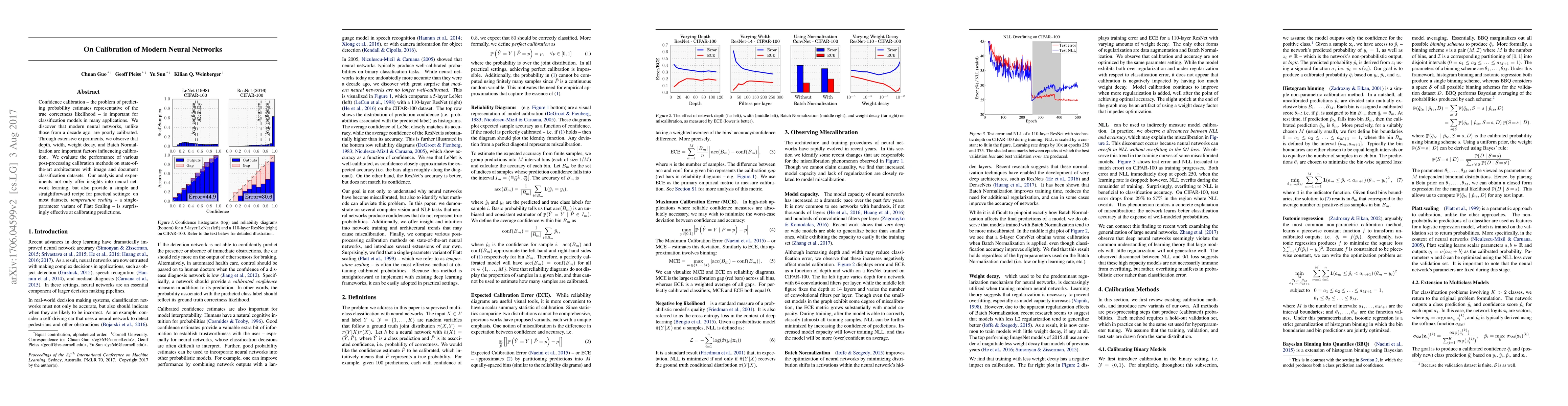 This paper investigates the calibration of modern neural networks, finding that they are poorly calibrated compared to older models. It highlights that factors such as depth, width, weight decay, and Batch Normalization impact calibration, and concludes that temperature scaling is an effective post-processing method for improving calibration in practical settings.