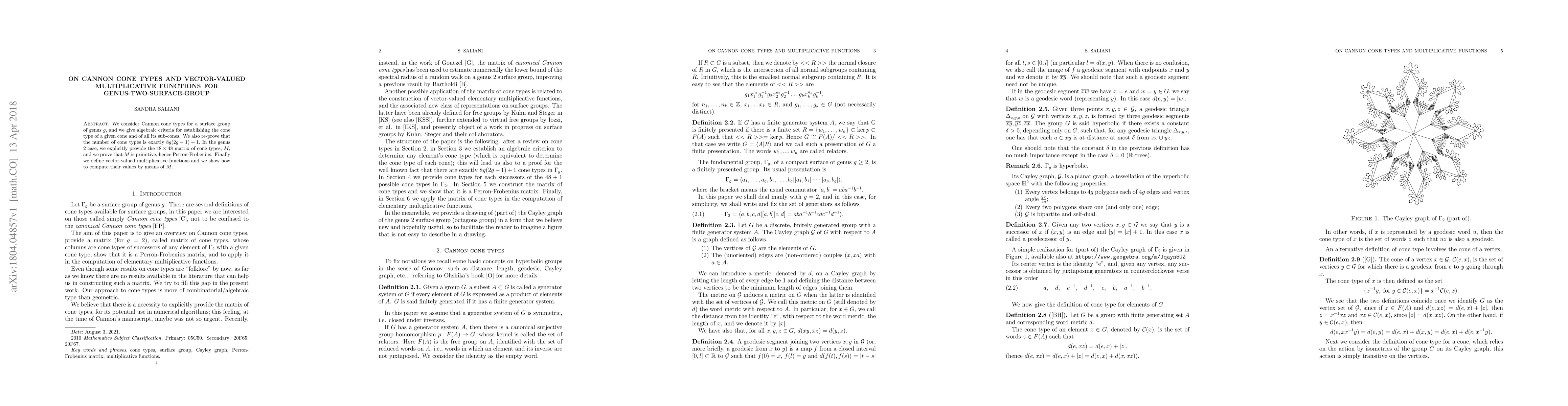 We consider Cannon cone types for a surface group of genus $g$, and we give algebraic criteria for establishing the cone type of a given cone and of all its sub-cones. We also re-prove that the number of cone types is exactly $8g(2g - 1)+1.$ In the genus $2$ case, we explicitly provide the $48\times 48$ matrix of cone types, $M,$ and we prove that $M$ is primitive, hence Perron-Frobenius. Finally we define vector-valued multiplicative functions and we show how to compute their values by means of $M$.