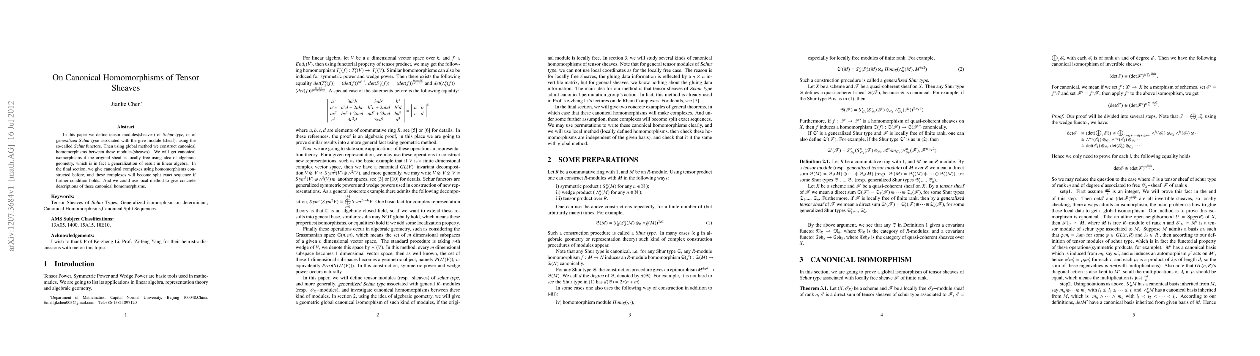 In this paper we define tensor modules(sheaves) of Schur type,or of generalized Schur type associated with the give module(sheaf), using the so-called Schur functors. Then using global method we construct canonical homomorphisms between these modules(sheaves). We will get canonical isomorphisms if the original sheaf is locally free using idea of algebraic geometry, which is in fact a generalization of result in linear algebra. In the final section, we give canonical complexes using homomorphisms constructed before, and these complexes will become split exact sequence if further condition holds. And we could use local method to give concrete descriptions of these canonical homomorphisms.