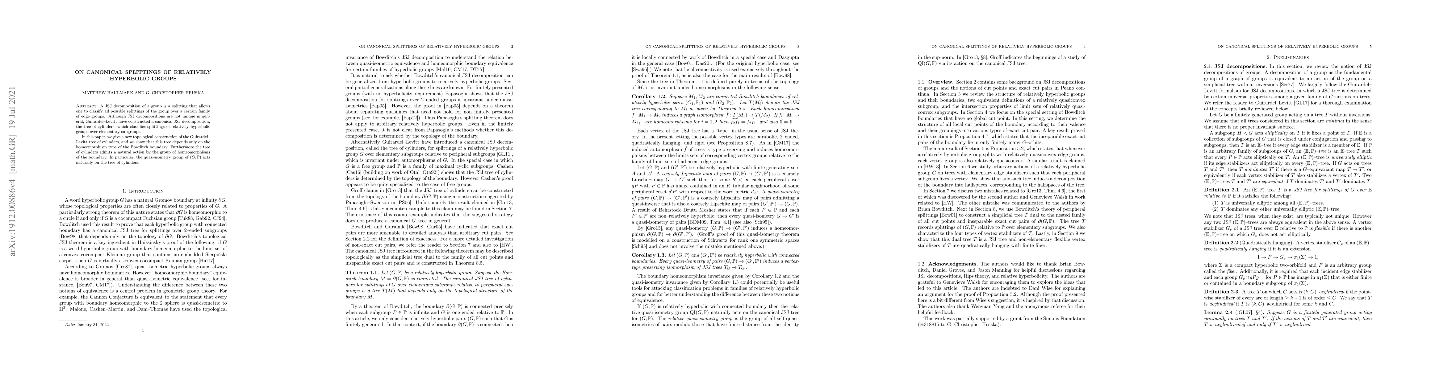 A JSJ decomposition of a group is a splitting that allows one to classify all possible splittings of the group over a certain family of edge groups. Although JSJ decompositions are not unique in general, Guirardel--Levitt have constructed a canonical JSJ decomposition, the tree of cylinders, which classifies splittings of relatively hyperbolic groups over elementary subgroups. In this paper, we give a new topological construction of the Guirardel--Levitt tree of cylinders, and we show that this tree depends only on the homeomorphism type of the Bowditch boundary. Furthermore, the tree of cylinders admits a natural action by the group of homeomorphisms of the boundary. In particular, the quasi-isometry group of $(G,\mathbb{P})$ acts naturally on the tree of cylinders.