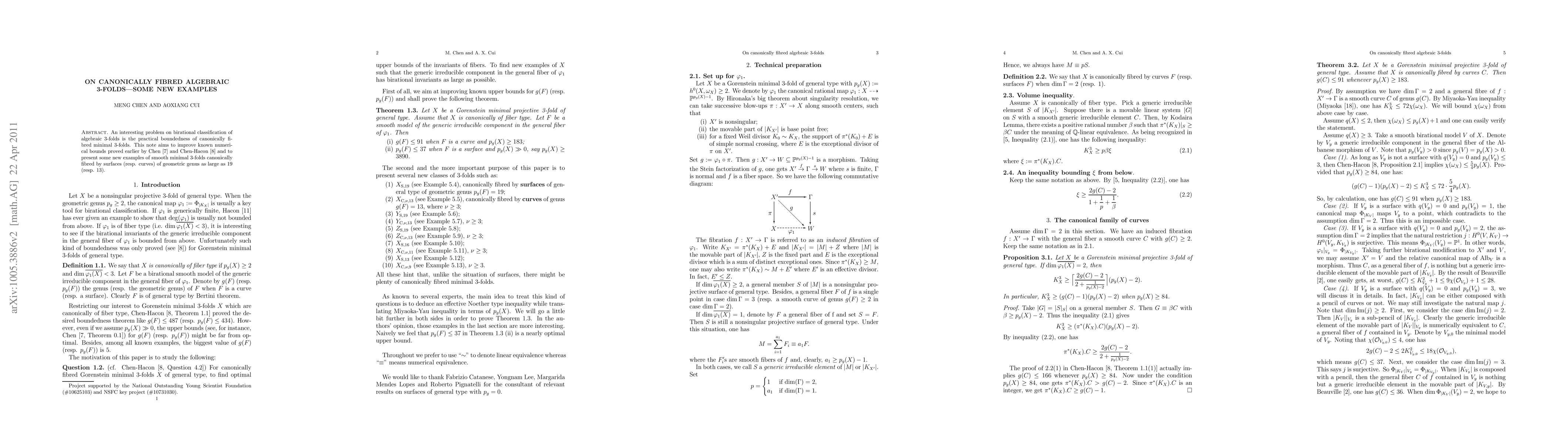 This paper presents new examples of smooth minimal 3-folds that are canonically fibred by surfaces and curves with large geometric genus, improving previous numerical bounds and discovering a new class of general type surfaces with genus 13.