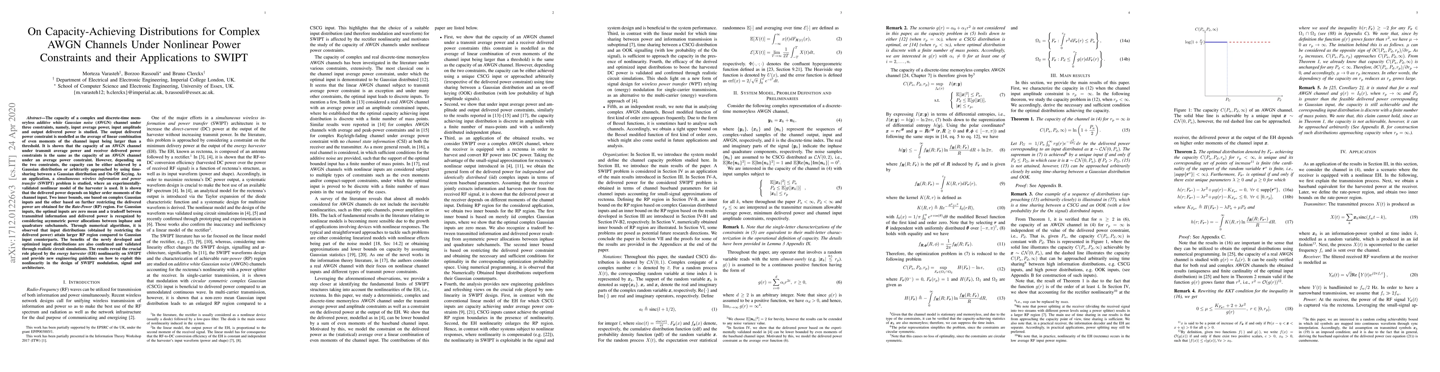 This paper investigates the capacity of complex AWGN channels under nonlinear power constraints, showing that capacity can be achieved by Gaussian distributions or approached via time-sharing with On-Off Keying. It applies these findings to SWIPT, demonstrating that delivered power depends on higher-order channel input moments, and provides inner bounds for the Rate-Power region, revealing a tradeoff between information and power delivery.