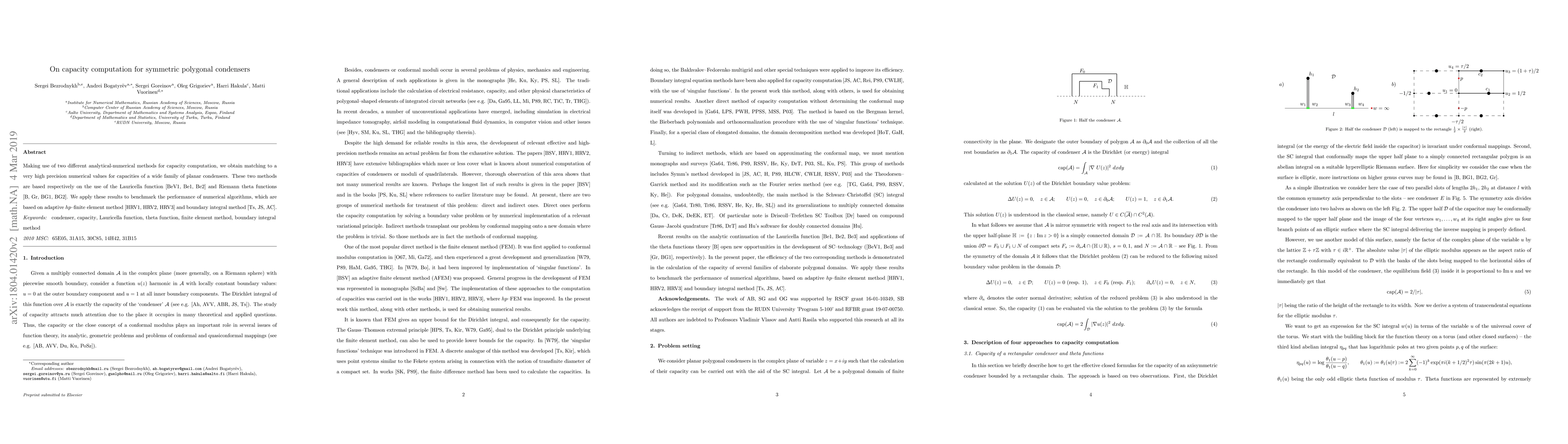 This paper presents two analytical-numerical methods for high-precision capacity computation of symmetric polygonal condensers, employing Lauricella functions and Riemann theta functions. The study benchmarks the performance of numerical algorithms, including adaptive $hp$-finite element and boundary integral methods.