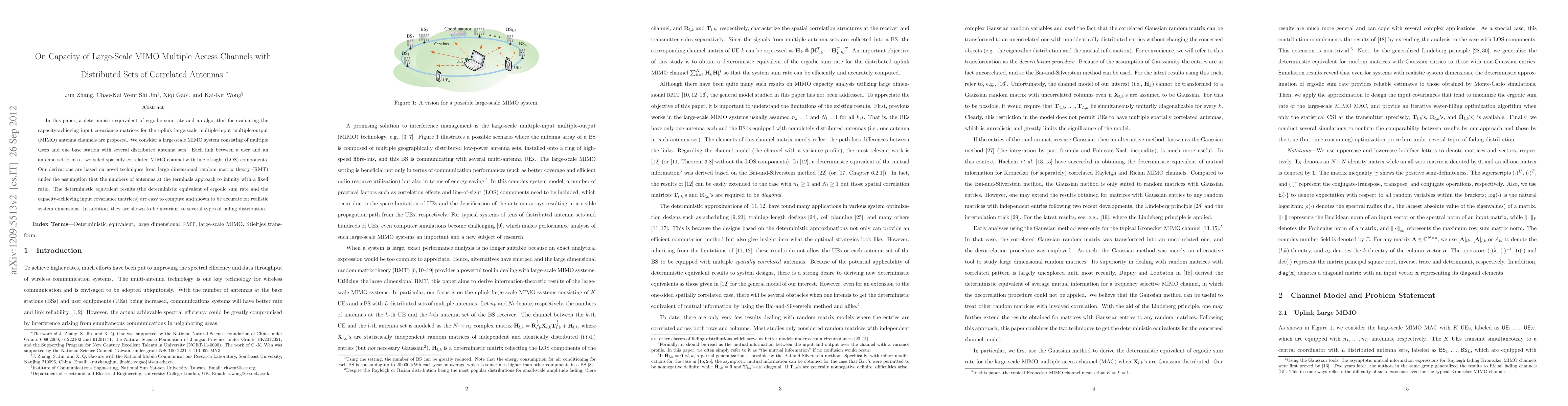 In this paper, a deterministic equivalent of ergodic sum rate and an algorithm for evaluating the capacity-achieving input covariance matrices for the uplink large-scale multiple-input multiple-output (MIMO) antenna channels are proposed. We consider a large-scale MIMO system consisting of multiple users and one base station with several distributed antenna sets. Each link between a user and an antenna set forms a two-sided spatially correlated MIMO channel with line-of-sight (LOS) components. Our derivations are based on novel techniques from large dimensional random matrix theory (RMT) under the assumption that the numbers of antennas at the terminals approach to infinity with a fixed ratio. The deterministic equivalent results (the deterministic equivalent of ergodic sum rate and the capacity-achieving input covariance matrices) are easy to compute and shown to be accurate for realistic system dimensions. In addition, they are shown to be invariant to several types of fading distribution.