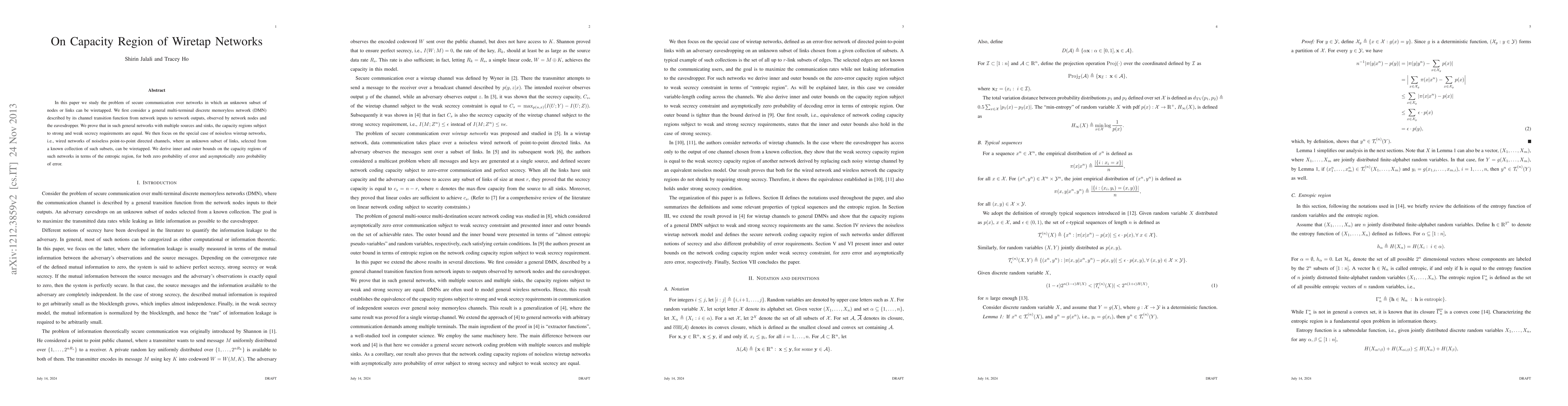In this paper we consider the problem of secure network coding where an adversary has access to an unknown subset of links chosen from a known collection of links subsets. We study the capacity region of such networks, commonly called "wiretap networks", subject to weak and strong secrecy constraints, and consider both zero-error and asymptotically zero-error communication. We prove that in general discrete memoryless networks modeled by discrete memoryless channels, the capacity region subject to strong secrecy requirement and the capacity region subject to weak secrecy requirement are equal. In particular, this result shows that requiring strong secrecy in a wiretap network with asymptotically zero probability of error does not shrink the capacity region compared to the case of weak secrecy requirement. We also derive inner and outer bounds on the network coding capacity region of wiretap networks subject to weak secrecy constraint, for both zero probability of error and asymptotically zero probability of error, in terms of the entropic region.