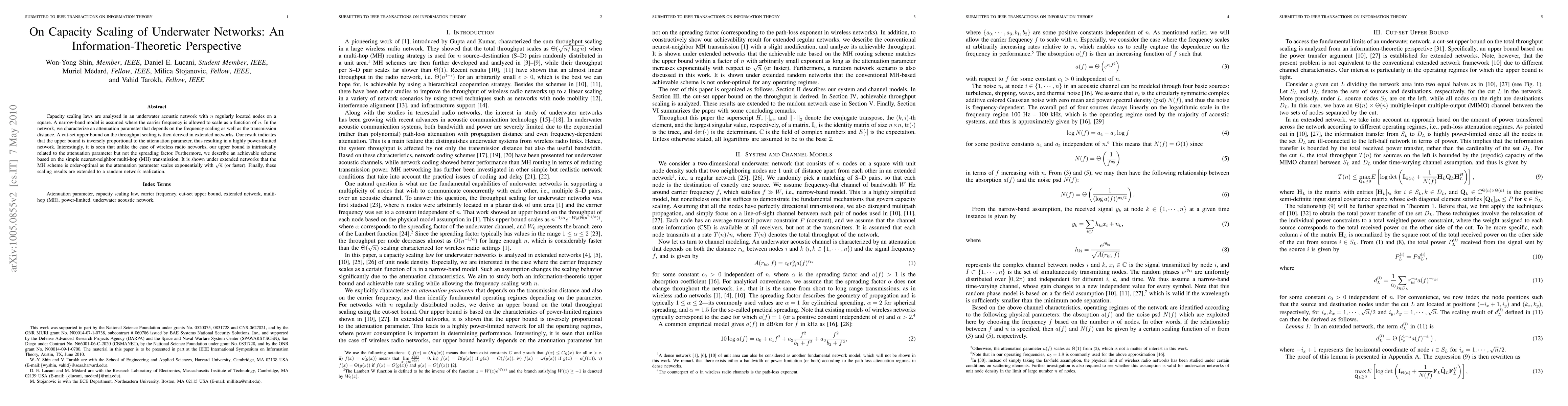 This paper investigates capacity scaling in underwater acoustic networks using an information-theoretic approach, revealing that throughput is inversely proportional to an attenuation parameter dependent on frequency scaling. Unlike wireless radio networks, the derived upper bound is linked to attenuation rather than spreading factor, and an optimal multi-hop transmission scheme is proposed for extended networks.