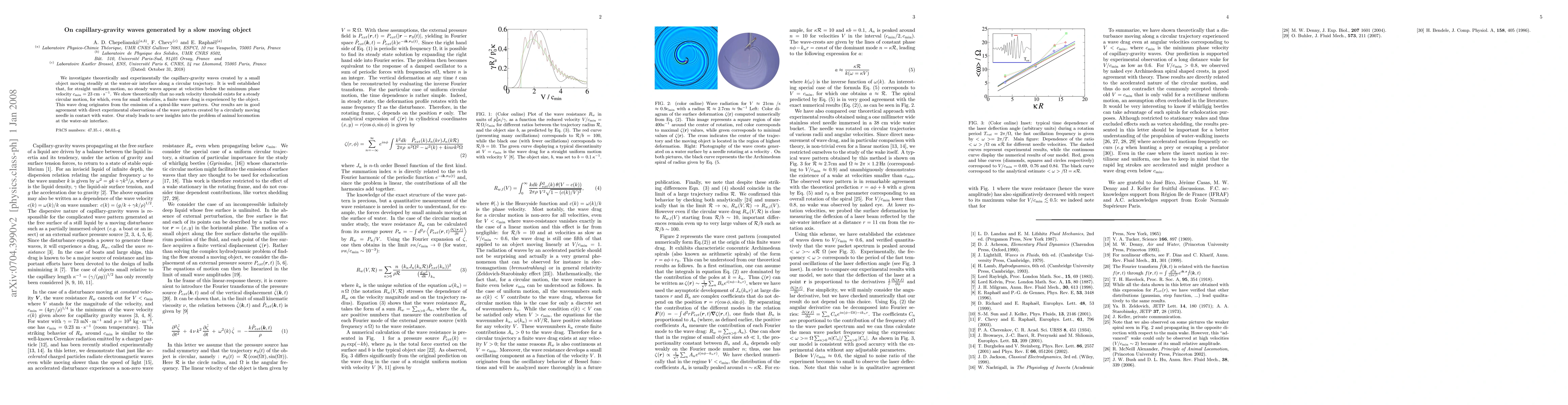 This paper theoretically and experimentally demonstrates that capillary-gravity waves can be generated by a small object moving in a steady circular path at the water-air interface, even at velocities below the minimum phase velocity. The study reveals that a spiral-like wave pattern and wave drag arise, providing new insights into animal locomotion on the water surface.