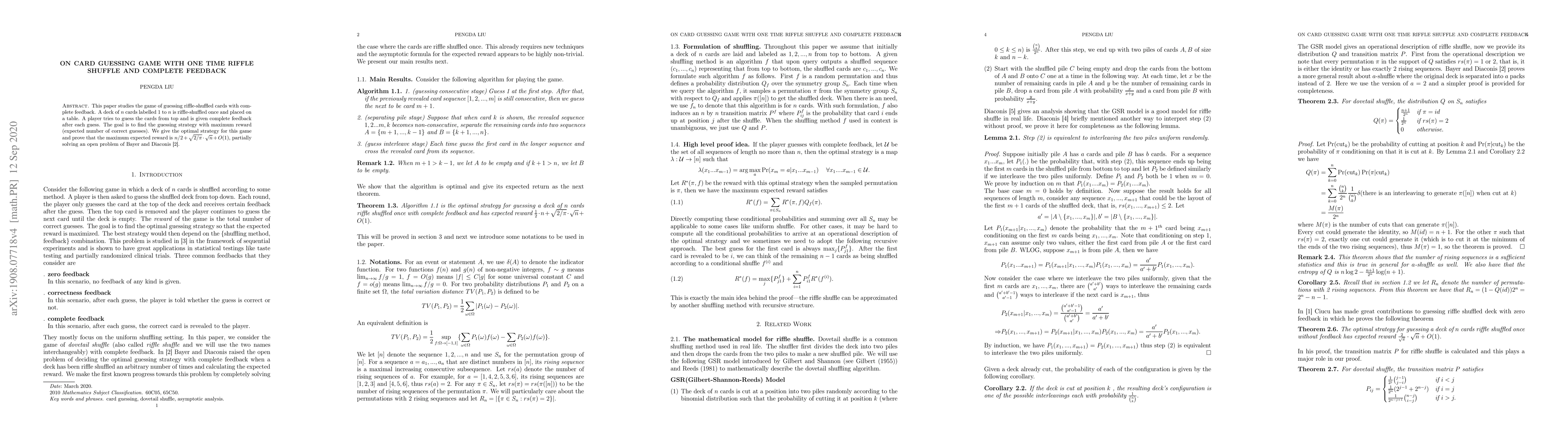 Researchers developed an optimal strategy for a card guessing game with complete feedback after each guess, achieving a maximum expected reward of n/2 + sqrt(2/pi)*sqrt(n) + O(1), partially solving an open problem in the field.