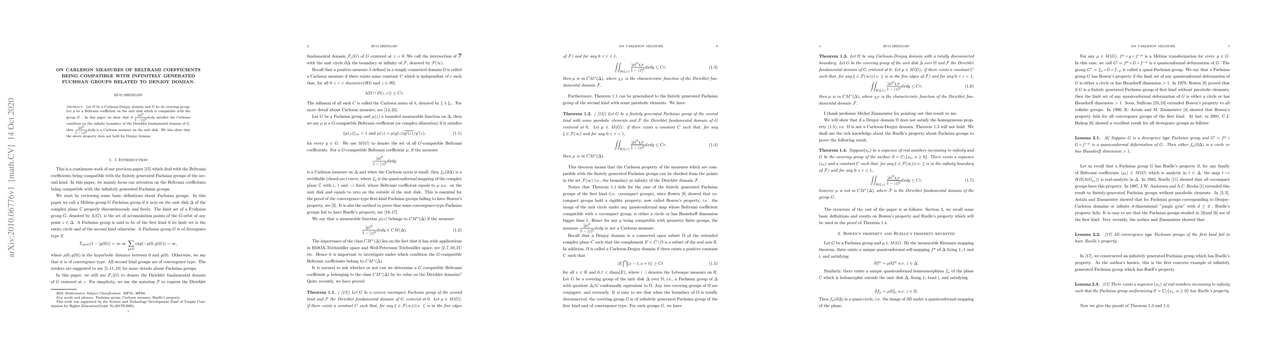 Let $\Omega$ be a Carleson-Denjoy domain and $G$ be its covering group. Let $\mu$ be a Beltrami coefficient on the unit disk which is compatible with the group $G$. In this paper we show that if $\frac{|\mu|^{2}}{1-|z|^{2}}dxdy$ satisfies the Carleson condition on the infinite boundary of the Dirichlet fundamental domain of $G$, then $\frac{|\mu|^{2}}{1-|z|^{2}}dxdy$ is a Carleson measure on the unit disk. We also show that the above property does not hold for Denjoy domain.
