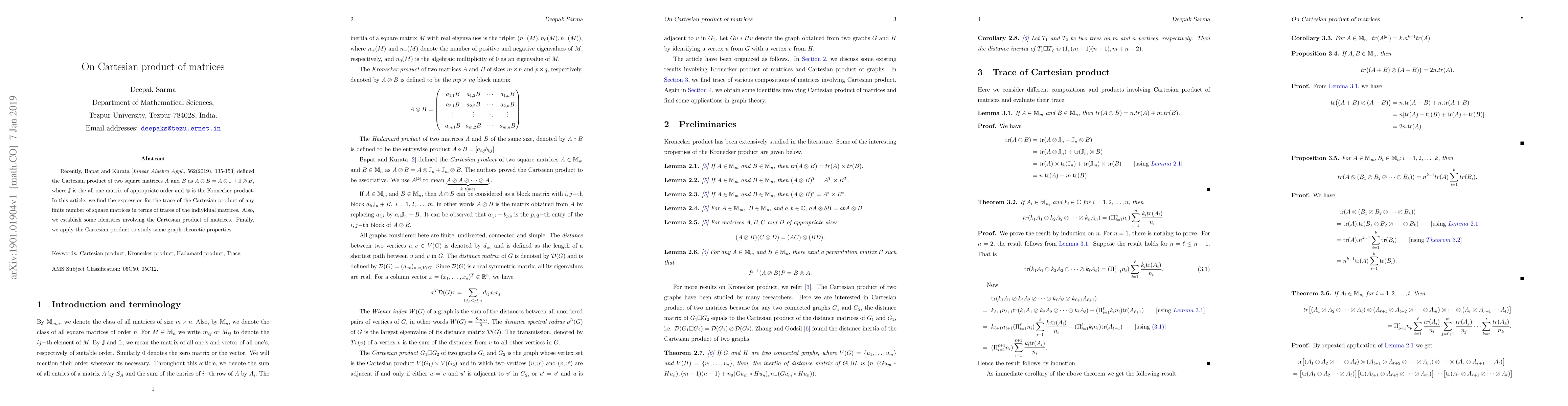 This paper extends the definition of the Cartesian product of matrices to multiple matrices, deriving an expression for its trace and establishing related identities. It also applies this product to explore graph-theoretic properties.