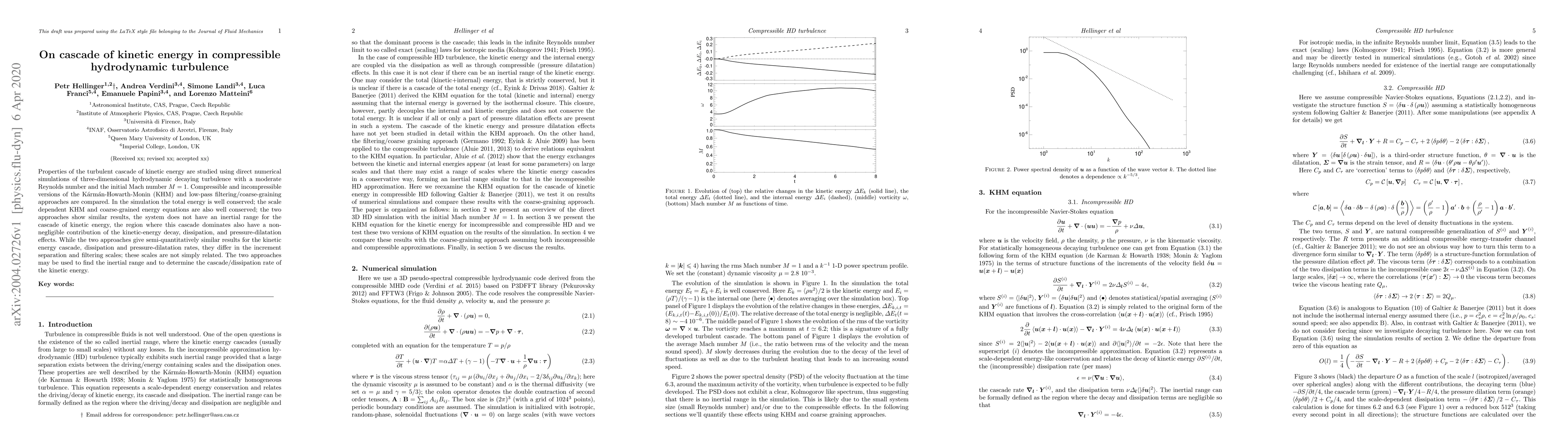 This paper investigates the turbulent cascade of kinetic energy in compressible hydrodynamic turbulence using direct numerical simulations, comparing the compressible and incompressible versions of the Karman-Howarth-Monin and low-pass filtering approaches. The study finds that while both approaches yield similar results, they differ in scale separation and filtering, and the system lacks a clear inertial range dominated solely by the kinetic energy cascade.