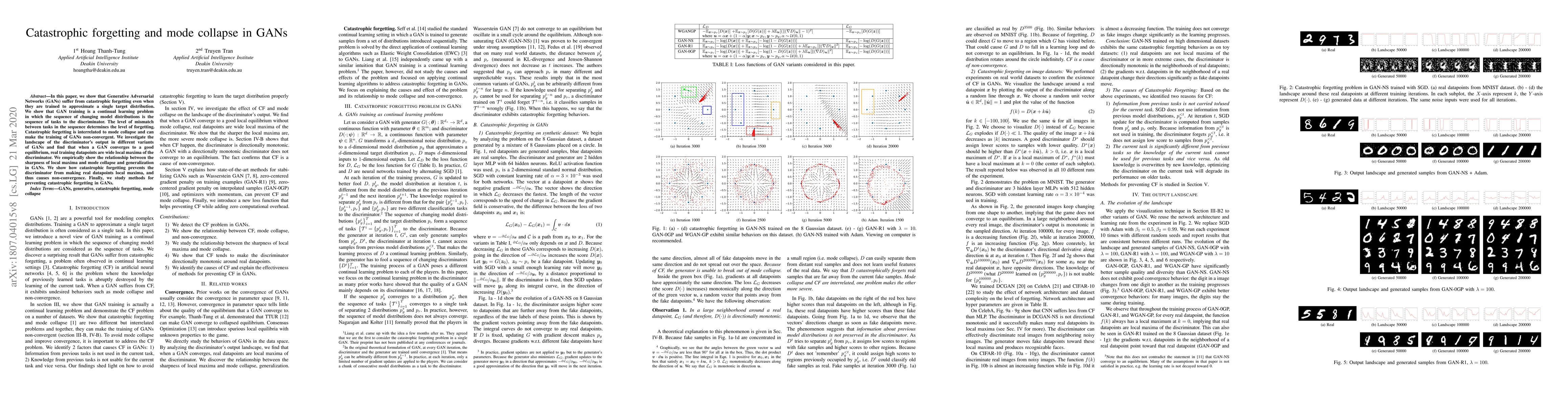 This paper investigates the phenomenon of catastrophic forgetting in Generative Adversarial Networks (GANs), demonstrating its connection to mode collapse and non-convergence. It proposes methods for mitigating these issues by addressing the continual learning problem inherent in GAN training.