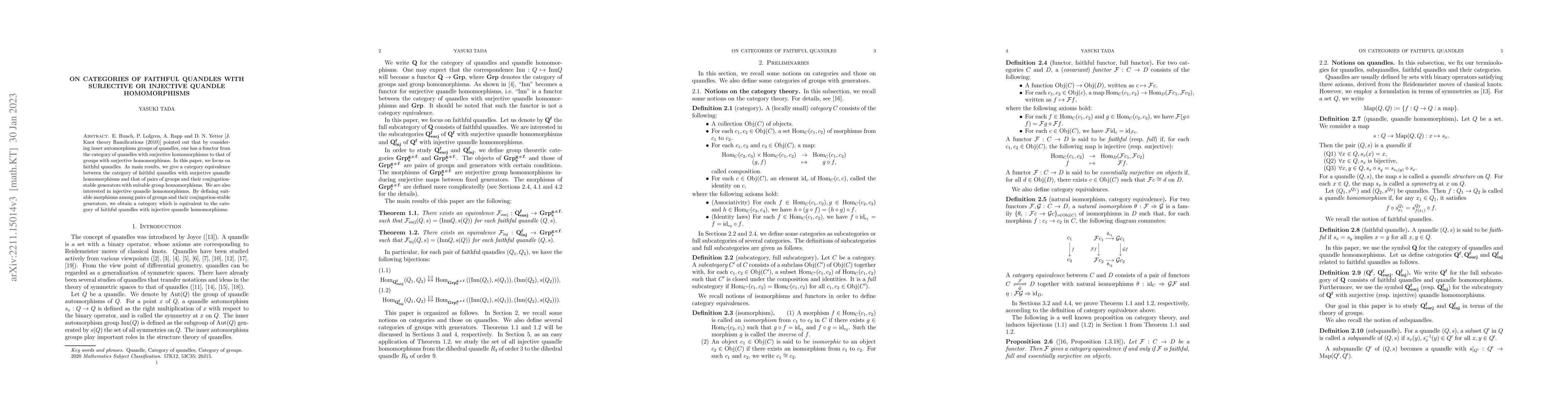 This paper establishes category equivalences between faithful quandles with specific types of homomorphisms and pairs of groups with associated generators and homomorphisms. It demonstrates equivalences for both surjective and injective quandle homomorphisms.