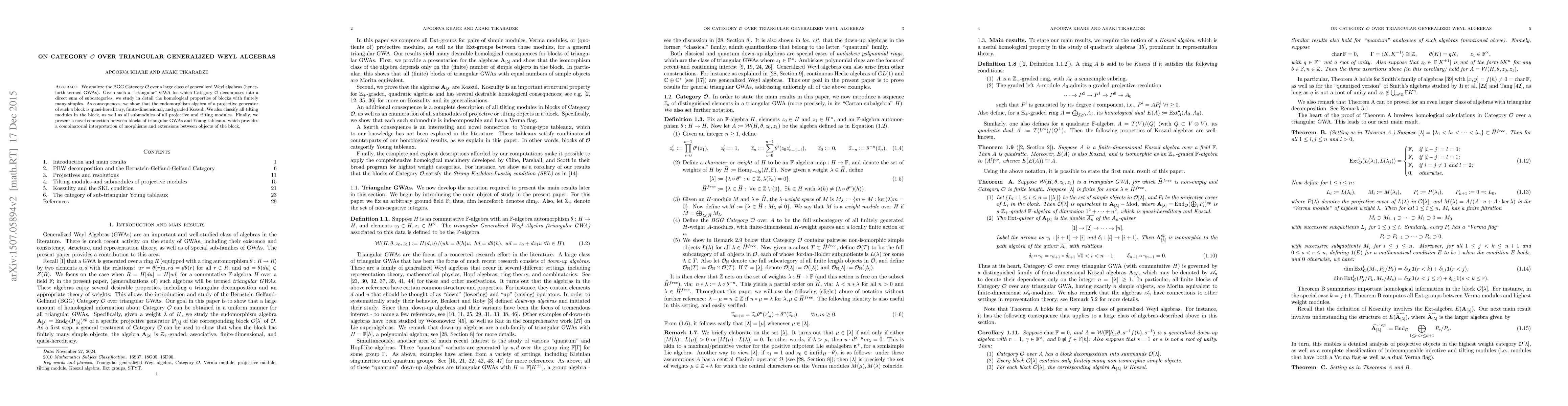 This paper examines BGG Category $\mathcal{O}$ for triangular generalized Weyl algebras (GWAs), revealing its decomposition into subcategories and homological properties. It demonstrates that the endomorphism algebra of projective generators is quasi-hereditary, finite-dimensional, and graded Koszul, and introduces a combinatorial link with Young tableaux for morphisms and extensions.
