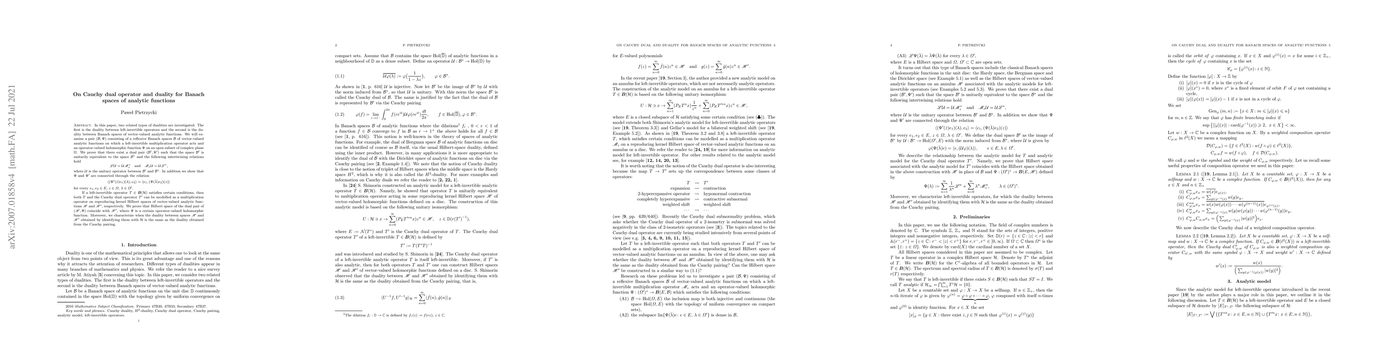 The paper investigates dualities between Banach spaces of vector-valued analytic functions and left-invertible operators, establishing intertwining relations that connect these spaces through unitary equivalence and a specific operator-valued holomorphic function.