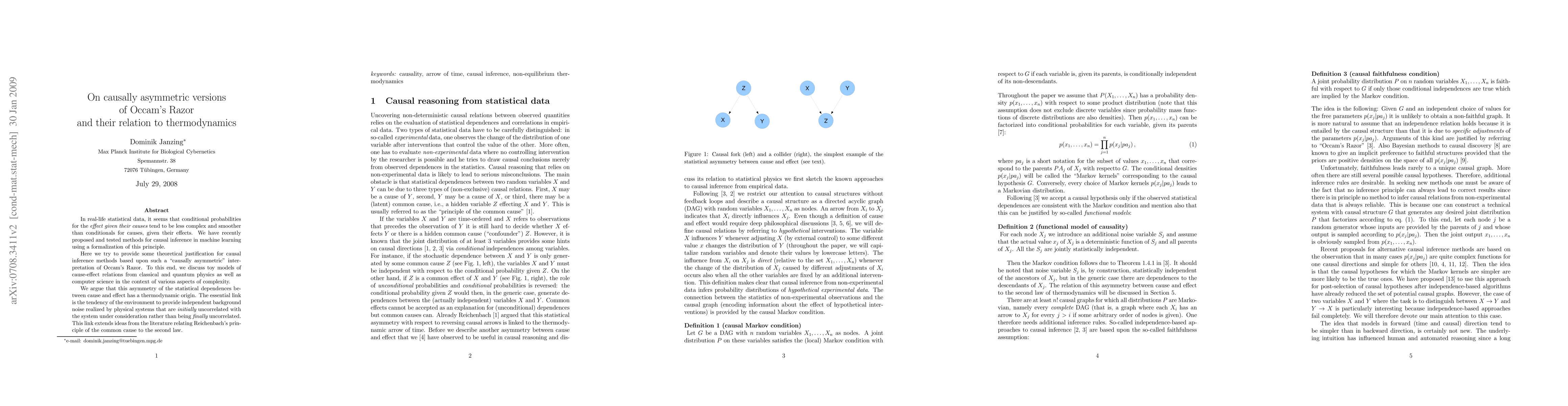 In real-life statistical data, it seems that conditional probabilities for the effect given their causes tend to be less complex and smoother than conditionals for causes, given their effects. We have recently proposed and tested methods for causal inference in machine learning using a formalization of this principle. Here we try to provide some theoretical justification for causal inference methods based upon such a ``causally asymmetric'' interpretation of Occam's Razor. To this end, we discuss toy models of cause-effect relations from classical and quantum physics as well as computer science in the context of various aspects of complexity. We argue that this asymmetry of the statistical dependences between cause and effect has a thermodynamic origin. The essential link is the tendency of the environment to provide independent background noise realized by physical systems that are initially uncorrelated with the system under consideration rather than being finally uncorrelated. This link extends ideas from the literature relating Reichenbach's principle of the common cause to the second law.