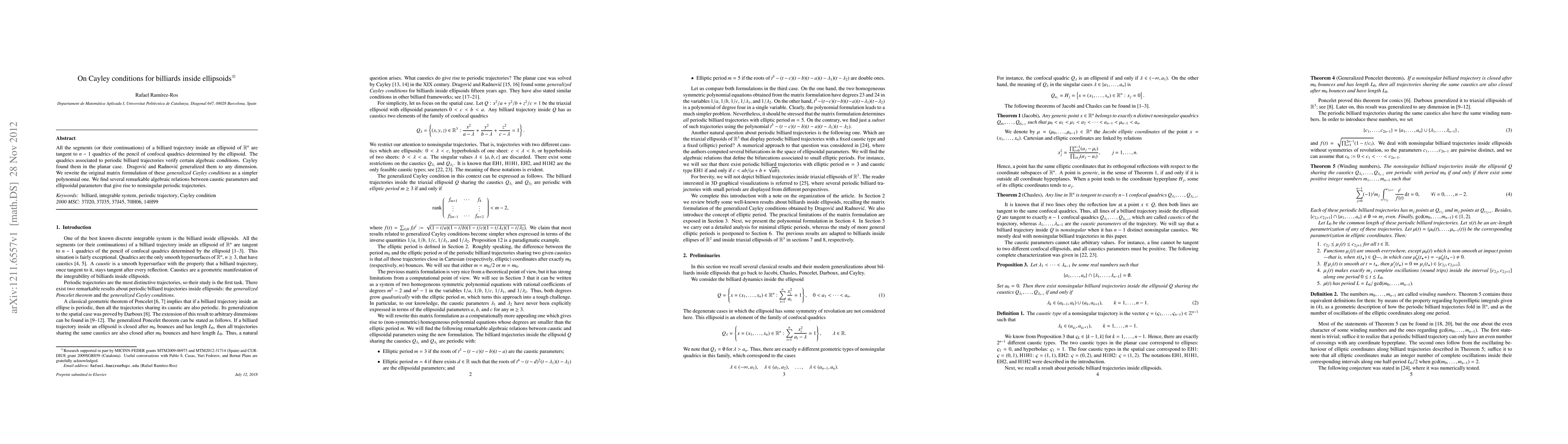 All the segments (or their continuations) of a billiard trajectory inside an ellipsoid of $\Rset^n$ are tangent to n-1 quadrics of the pencil of confocal quadrics determined by the ellipsoid. The quadrics associated to periodic billiard trajectories verify certain algebraic conditions. Cayley found them in the planar case. Dragovi\'{c} and Radnovi\'{c} generalized them to any dimension. We rewrite the original matrix formulation of these generalized Cayley conditions as a simpler polynomial one. We find several remarkable algebraic relations between caustic parameters and ellipsoidal parameters that give rise to nonsingular periodic trajectories.