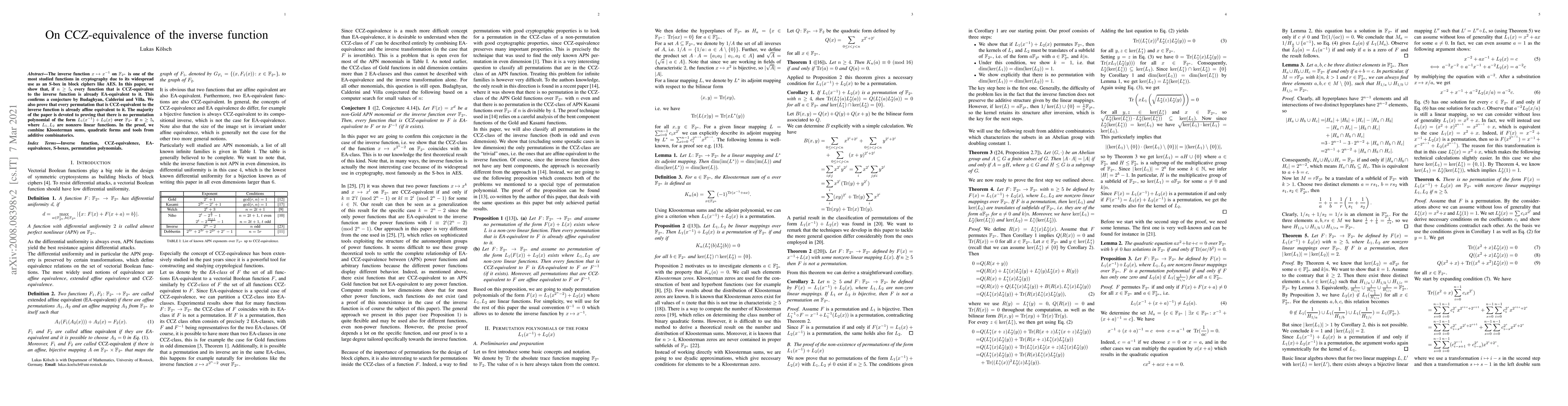 This paper demonstrates that for $n\geq 5$, any CCZ-equivalent function to the inverse function on $\mathbb{F}_{2^n}$ is also EA-equivalent and affine equivalent to it, confirming a conjecture. It also proves the nonexistence of permutation polynomials of a specific form over $\mathbb{F}_{2^n}$ using Kloosterman sums and additive combinatorics.