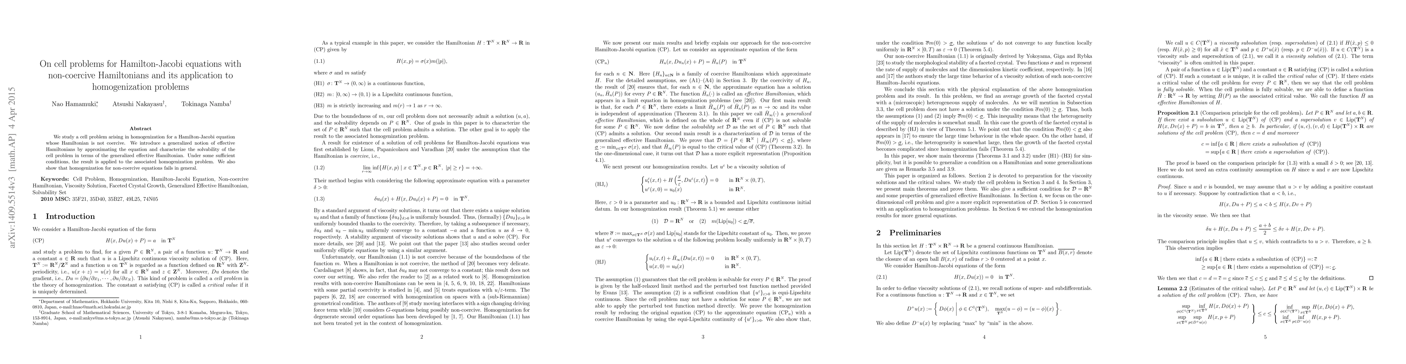 This paper investigates a cell problem in homogenization for Hamilton-Jacobi equations with non-coercive Hamiltonians, introducing a generalized effective Hamiltonian to characterize solvability. It concludes that homogenization generally fails for non-coercive equations under certain conditions.