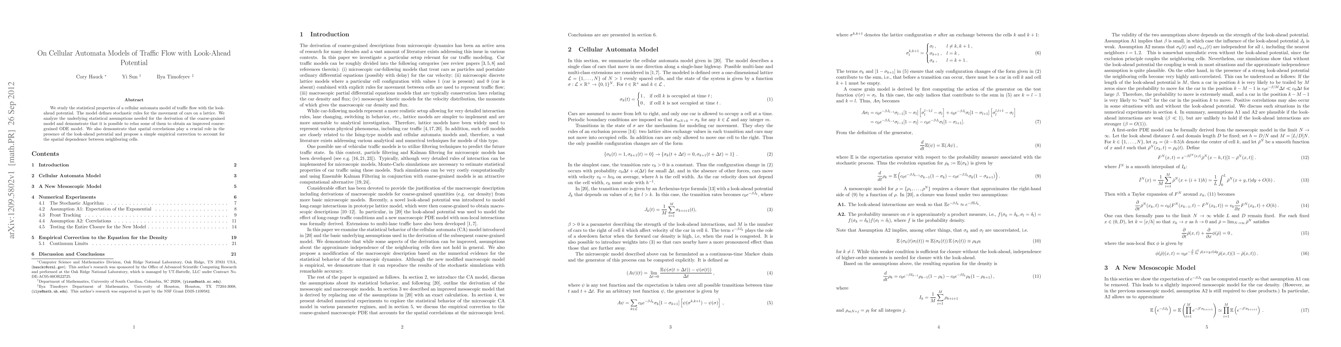 Researchers developed a cellular automata model to simulate traffic flow with look-ahead potential, showing that relaxing some statistical assumptions can improve the coarse-grained ODE model and accounting for spatial correlations is crucial.