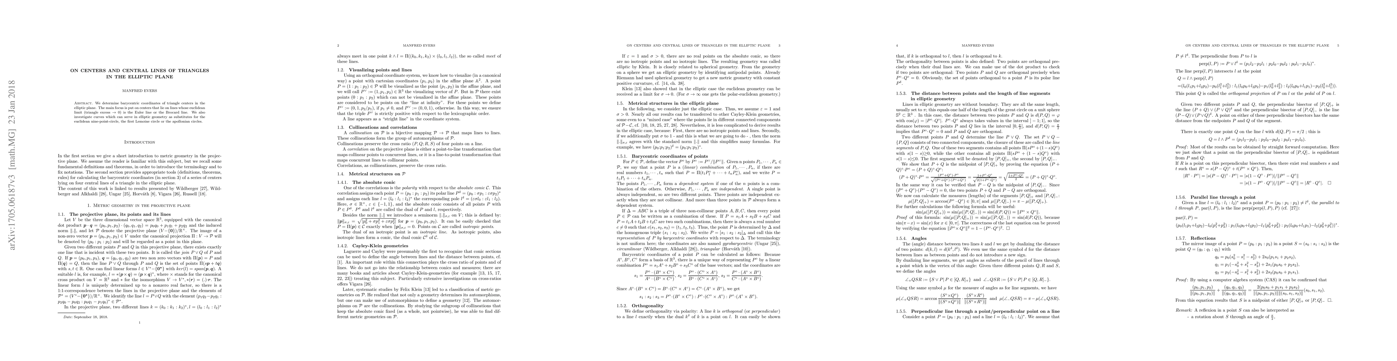 We determine barycentric coordinates of triangle centers in the elliptic plane. The main focus is put on centers that lie on lines whose euclidean limit (triangle excess --> 0) is the Euler line or the Brocard line. We also investigate curves which can serve in elliptic geometry as substitutes for the euclidean nine-point-circle, the first Lemoine circle or the apollonian circles.